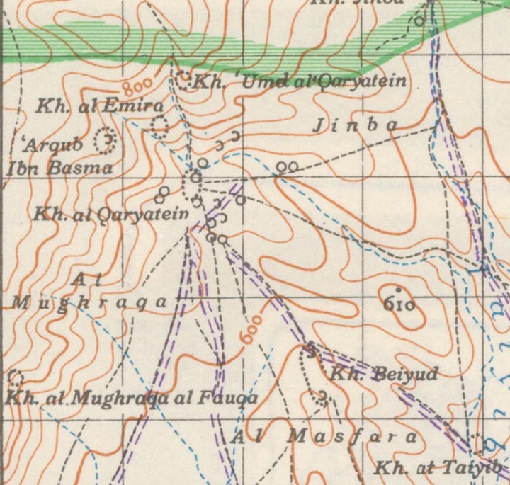 A 194os/50s map shows the area around the site (here: Kh. al Qaryatein”).