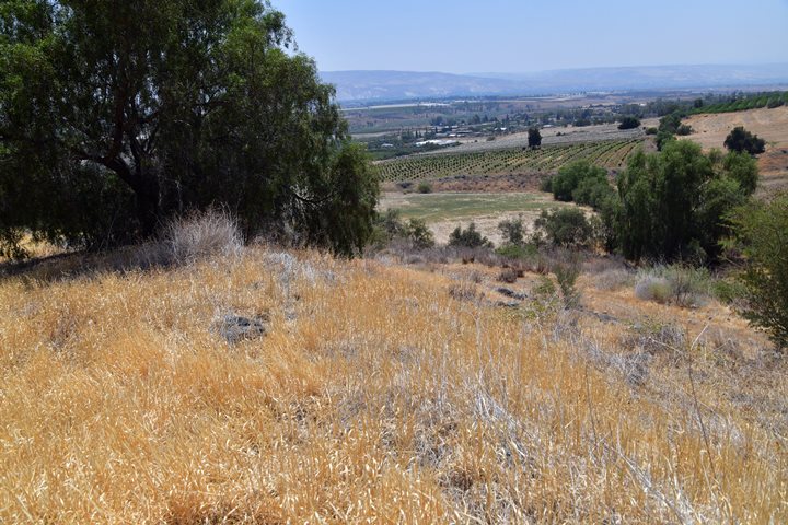 In the green bush below the site on the east is the location of the spring of Anin. In the far background is the Jordan valley.