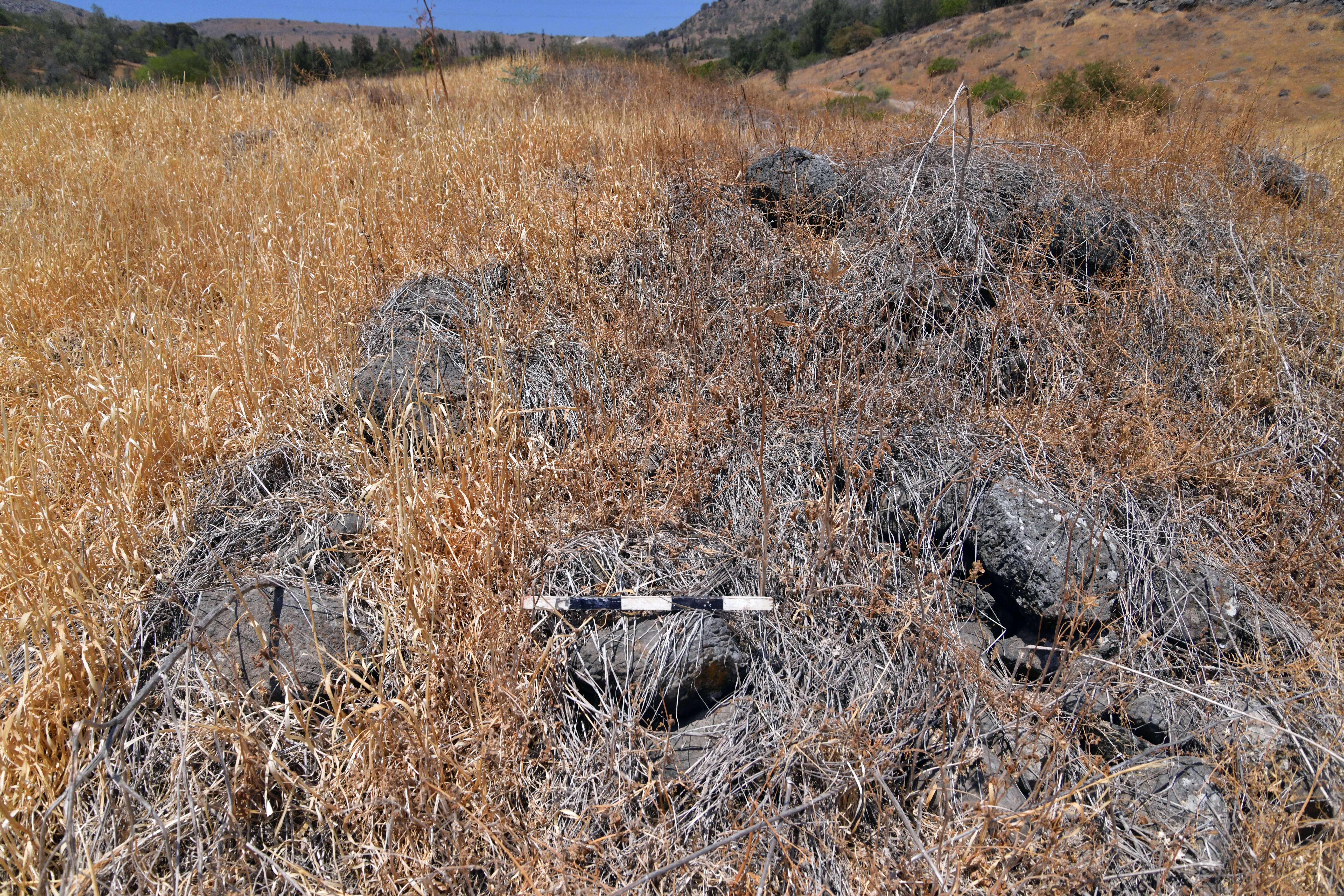 At the time we surveyed the site it was covered with dry weed, but the lines of the walls of the mound were partially visible. Based on our survey, we saw that the upper side of the walls were aligned in a rectangular shape, as marked on this south-west drone view: