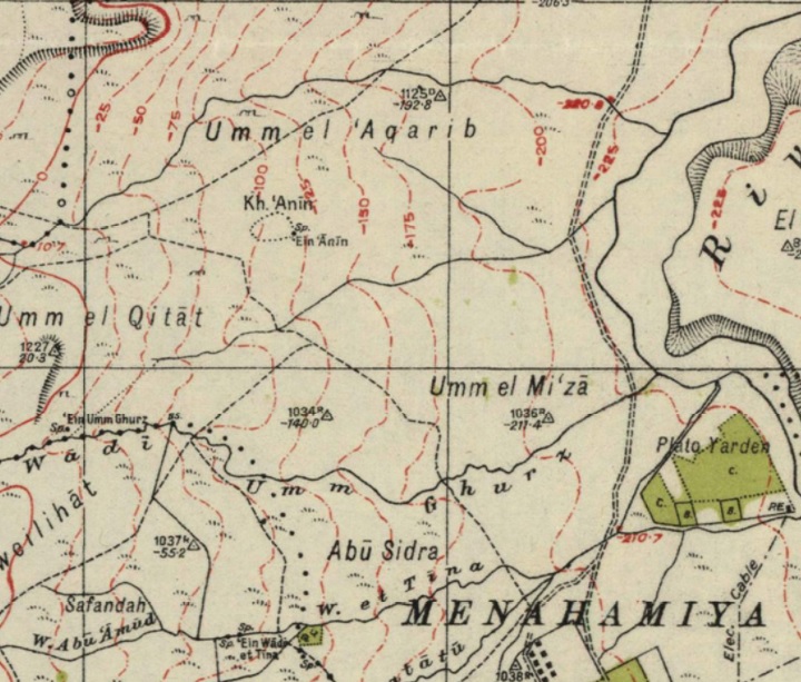 A section of the 1940s British map shows the area around the site, which is seen above the cliff. Notice that there is a route (a dashed line) that descends from the Sirin heights thru the south side of Anin, continuing south east to Menahamiya. Another route descends thru Kh. Anin on its north side and continues north east to the Jordan crossing at Ubeidiya or continues north to the Sea of Galilee.