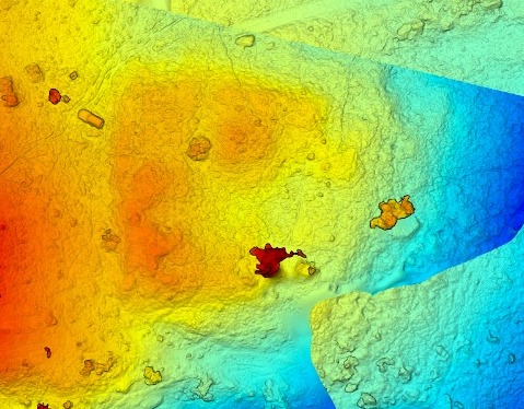 To better understand the topography of the site, we used a 3D software to see the plan of the site. A set of mosaic photos were captured by our drone over the site, then were converted to a 3D view by Ayelet Keidar. A “heat map” of the heights was also generated, showing a raised area (orange color) in the center, with slopes on all directions, and low areas on the south and east sides. The larger orange/red objects are bushes and trees.
