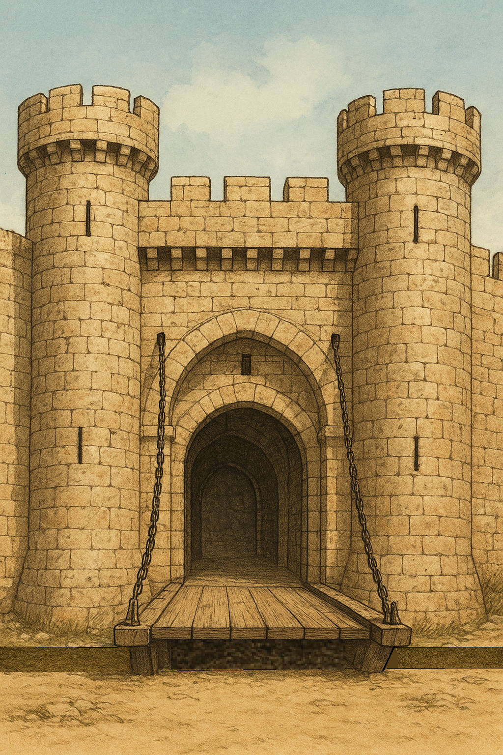 Access through the gate was controlled by a drawbridge spanning a dry moat. For defense, the bridge could be pulled up to close the gate opening entirely. To allow entry, it was drawn down to serve as a pathway across the moat.