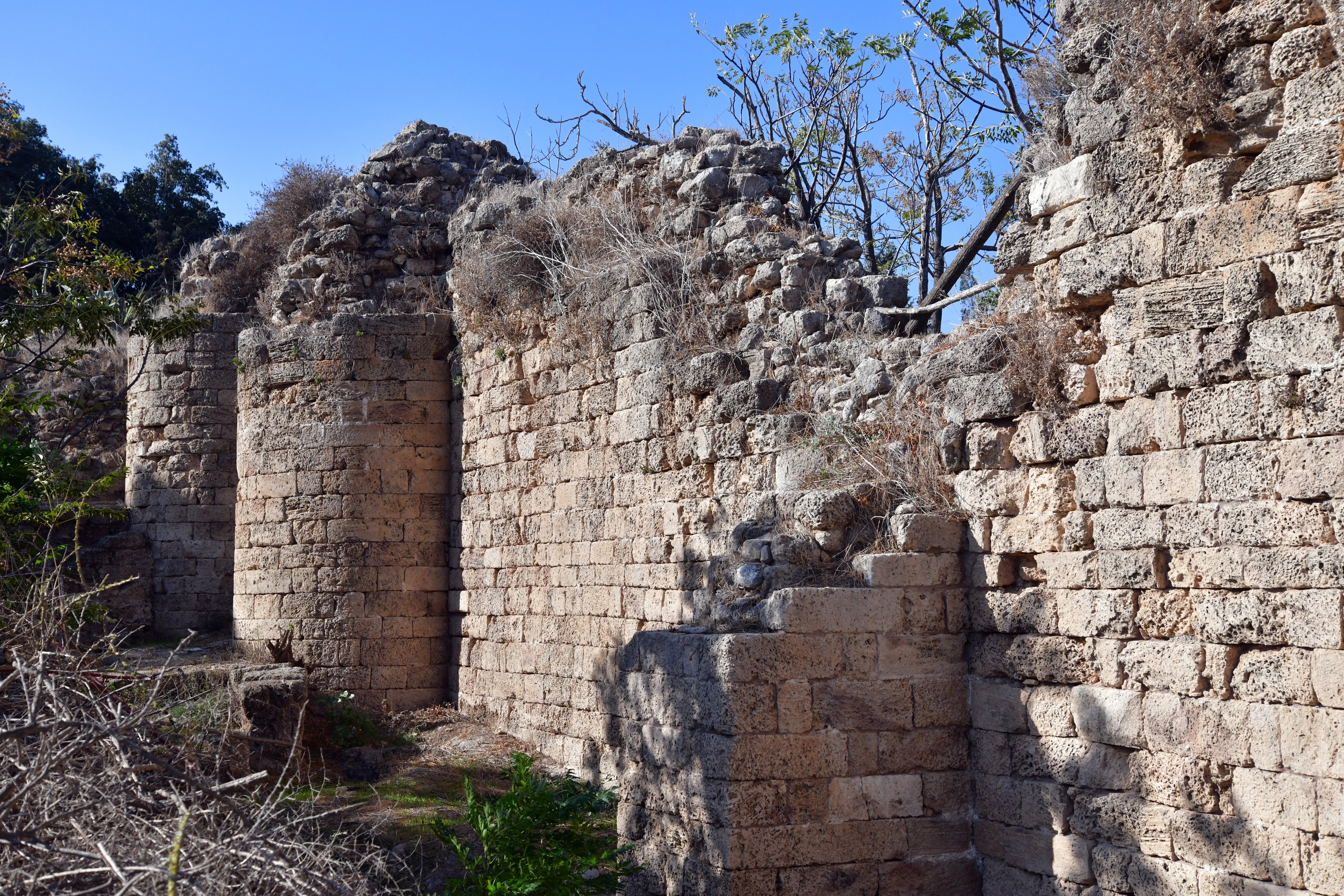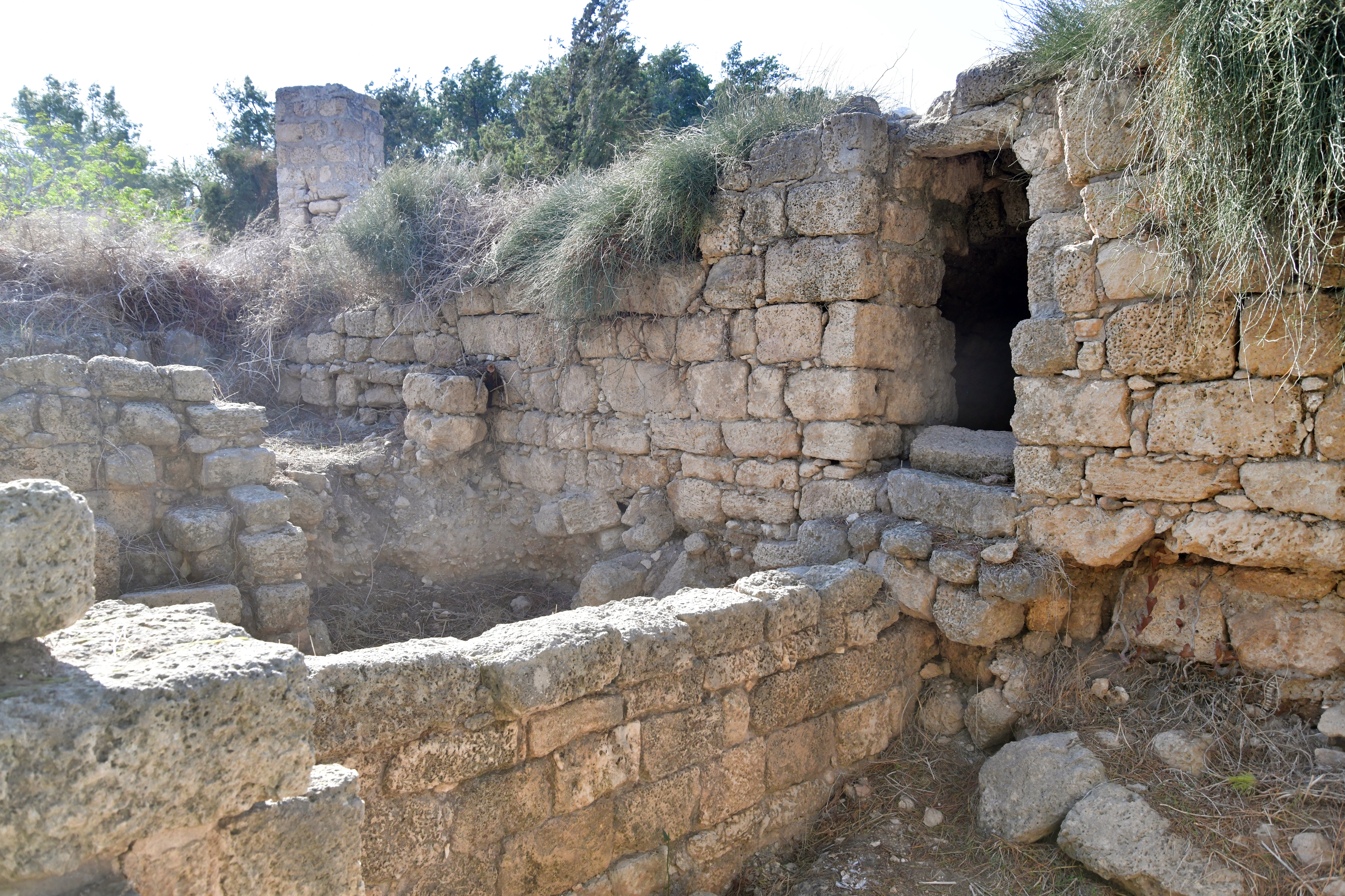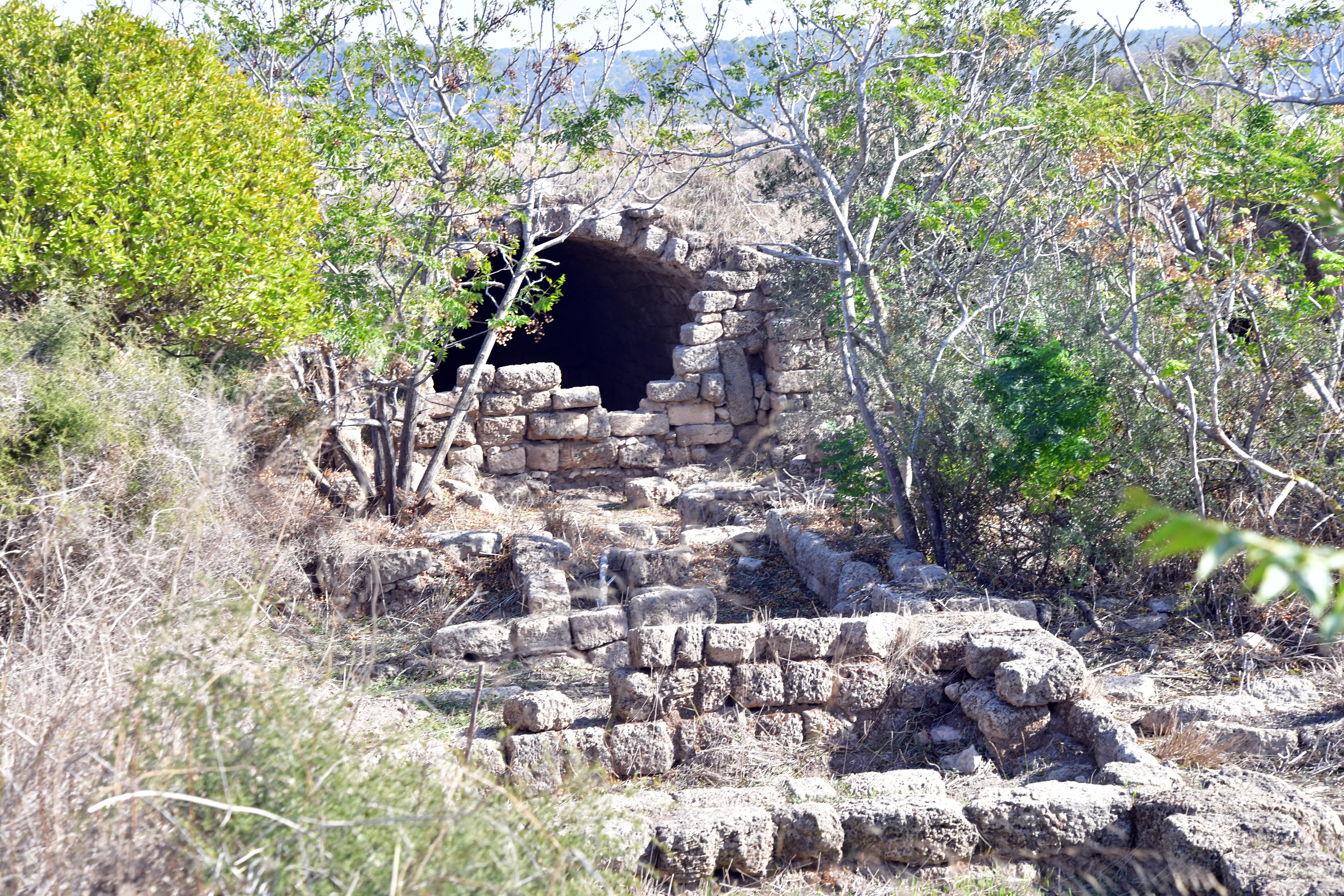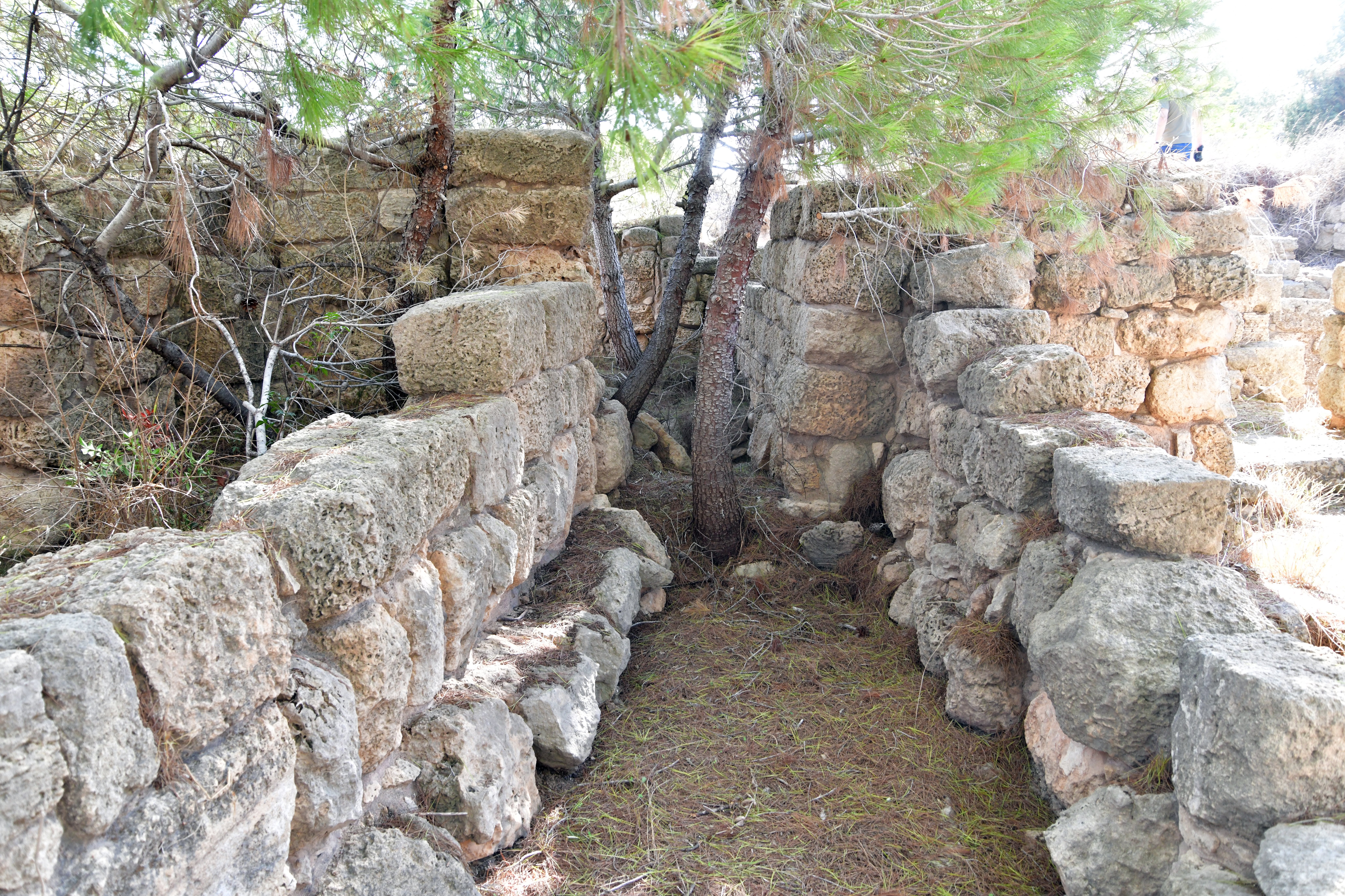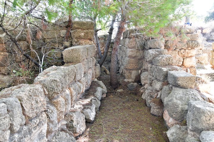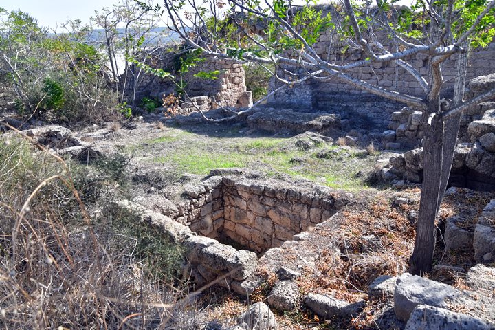 The Crusaders built a fortress (“Cafarlet” or “Capharlet”) on the north-eastern side of the sandstone ridge. The fortress was a 58M x 50M rectangular structure with circular solid towers on all corners, and a gate located on its southern wall. The photo below shows the gate on its southern side, and the south eastern section of the wall. A corner tower is seen at the edge of the wall.
