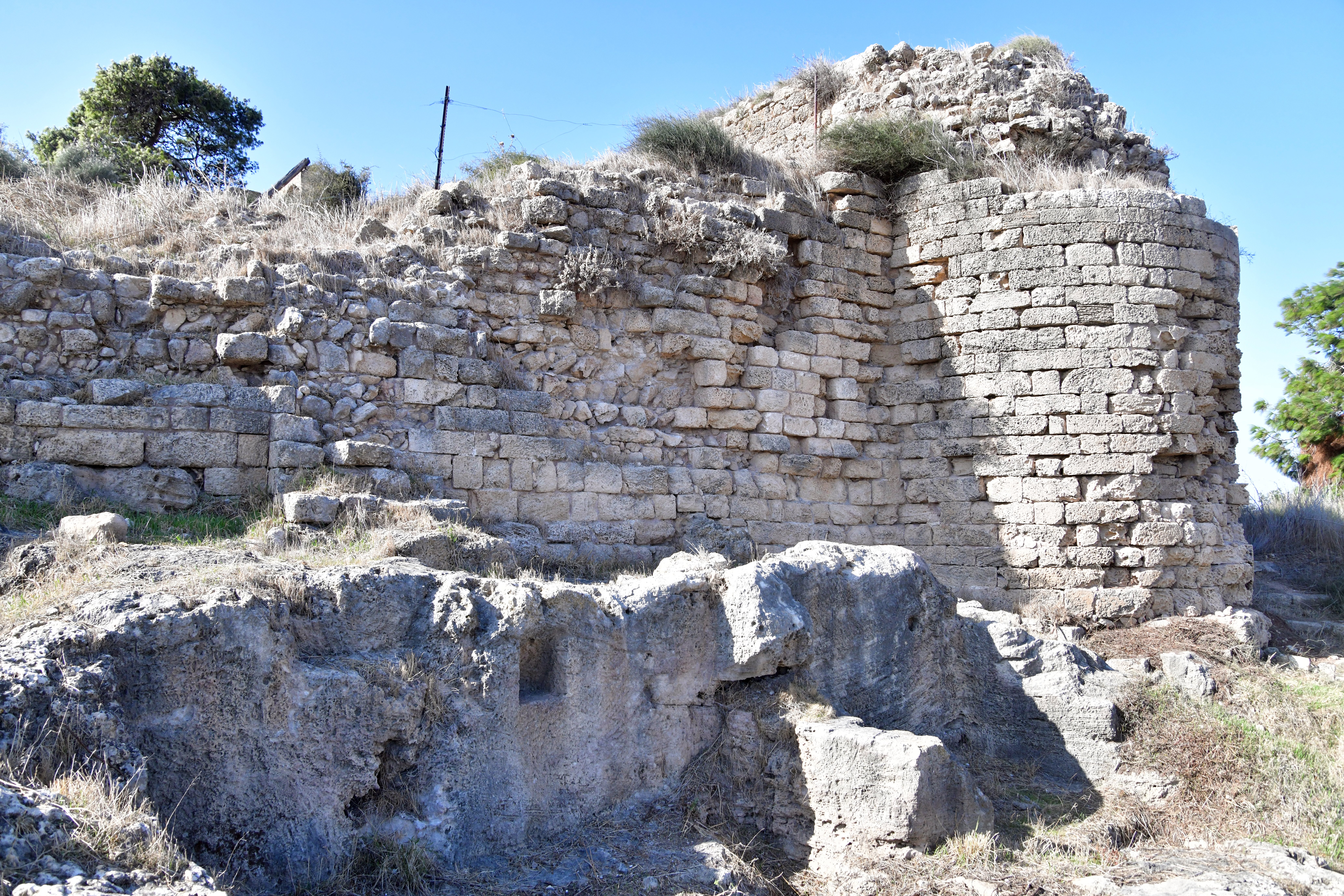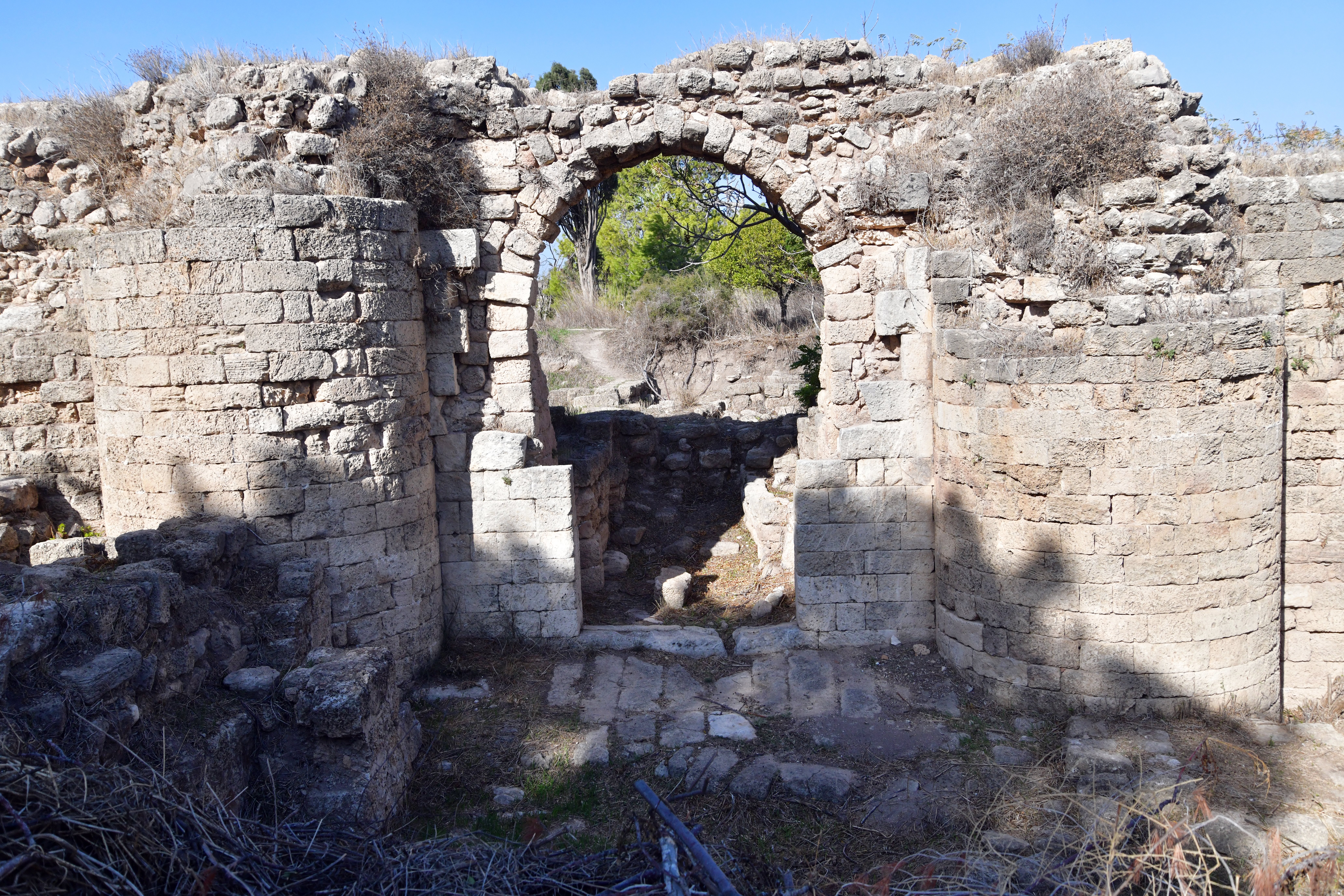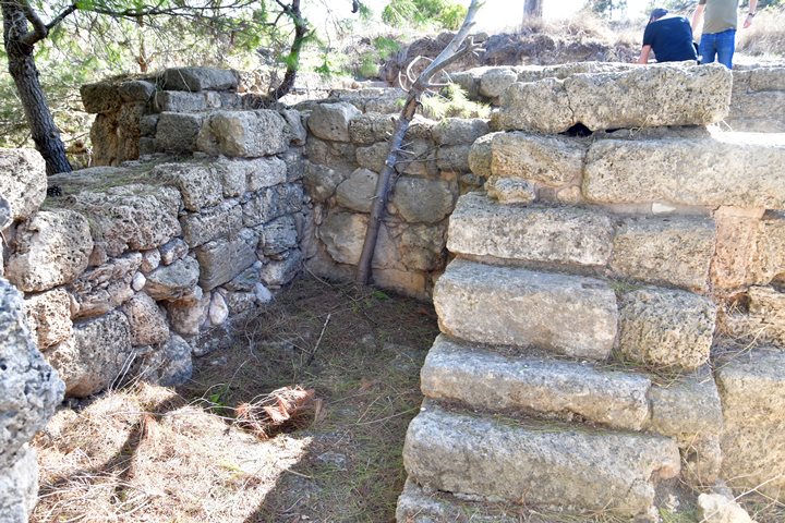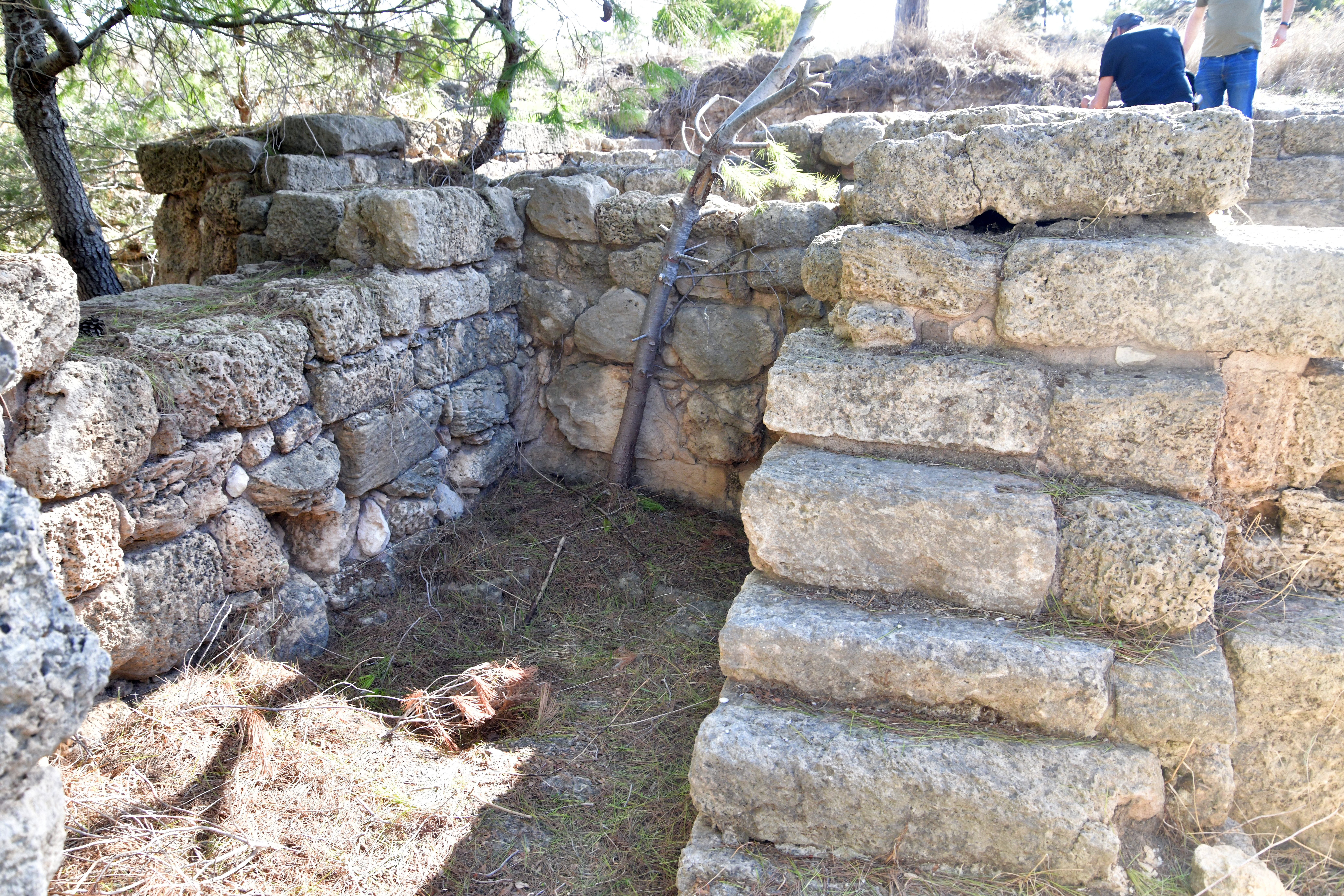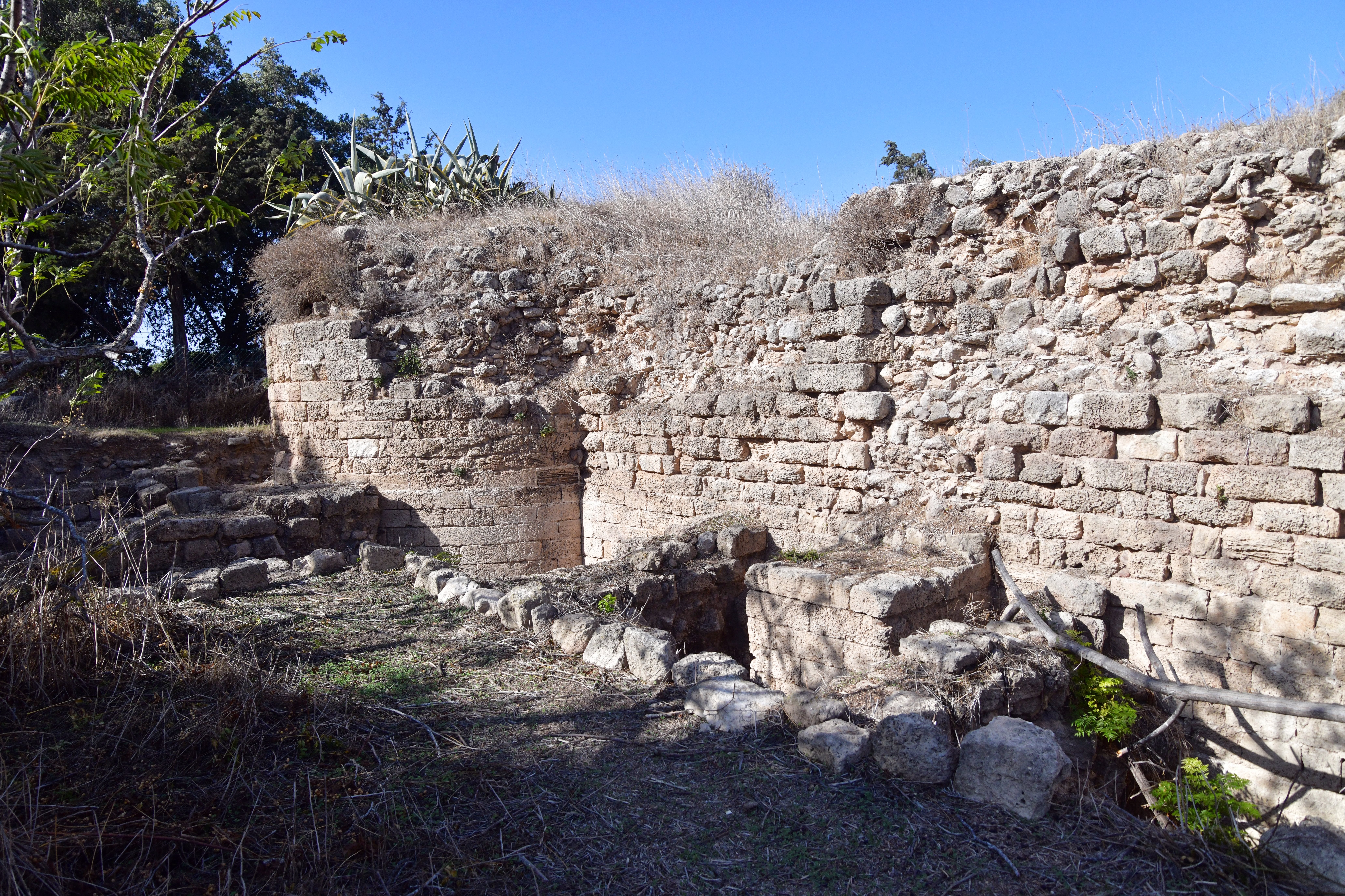 The Crusaders built a fortress (“Cafarlet” or “Capharlet”) on the north-eastern side of the sandstone ridge. The fortress was a 58M x 50M rectangular structure with circular solid towers on all corners, and a gate located on its southern wall. The photo below shows the gate on its southern side, and the south eastern section of the wall. A corner tower is seen at the edge of the wall.