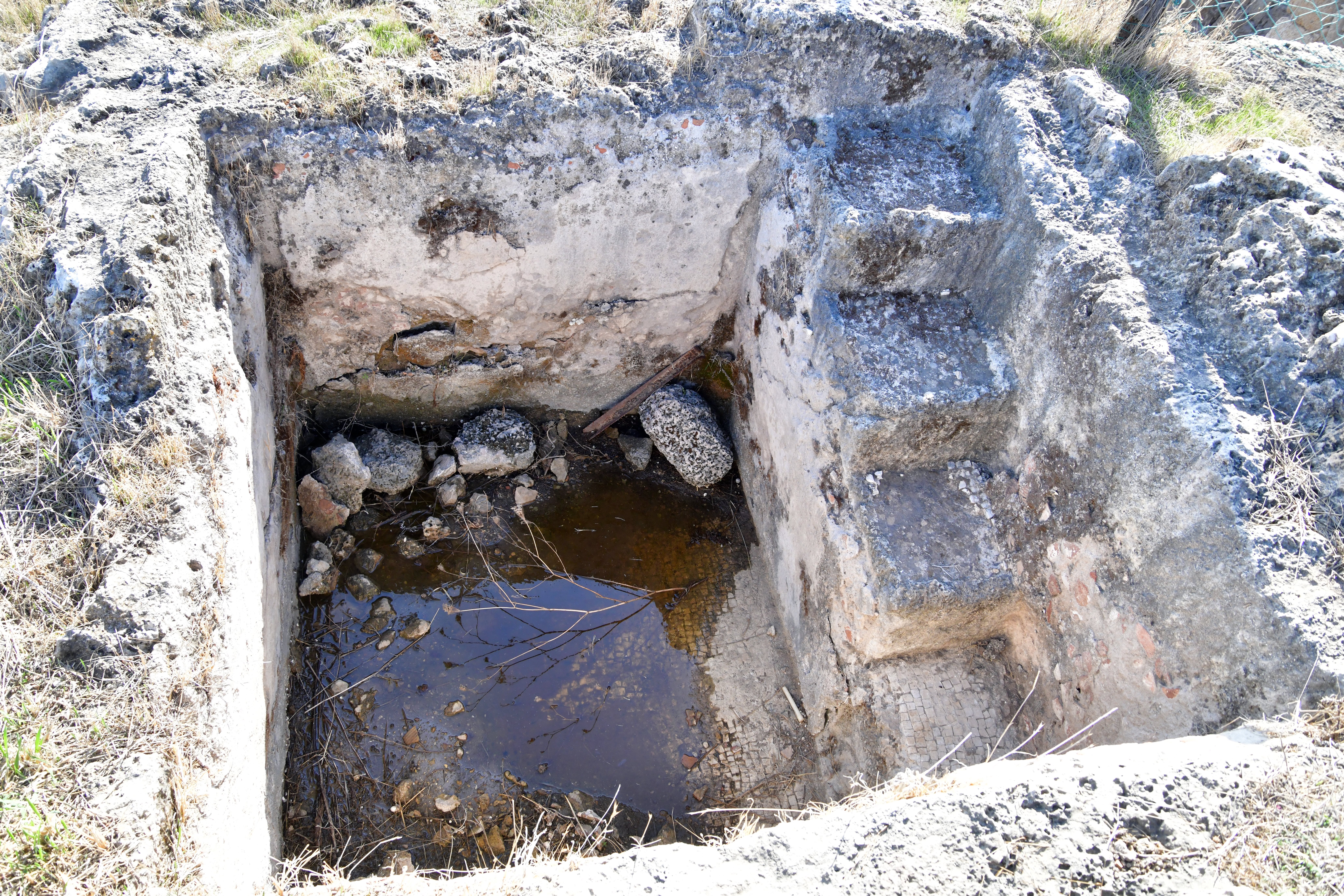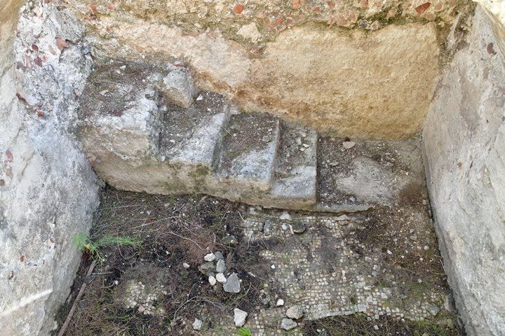 A winepress is also found here, with the same plan as the winepress that was found inside the fortress: square pool, staircase, plastered walls, mosic floor.