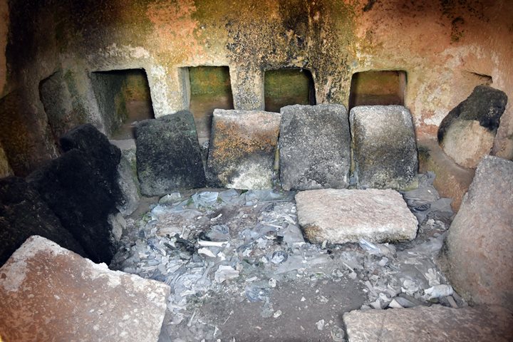 It had a rolling stone that stood on the hidden left side, but now its pieces lie on the floor before the burial cave.