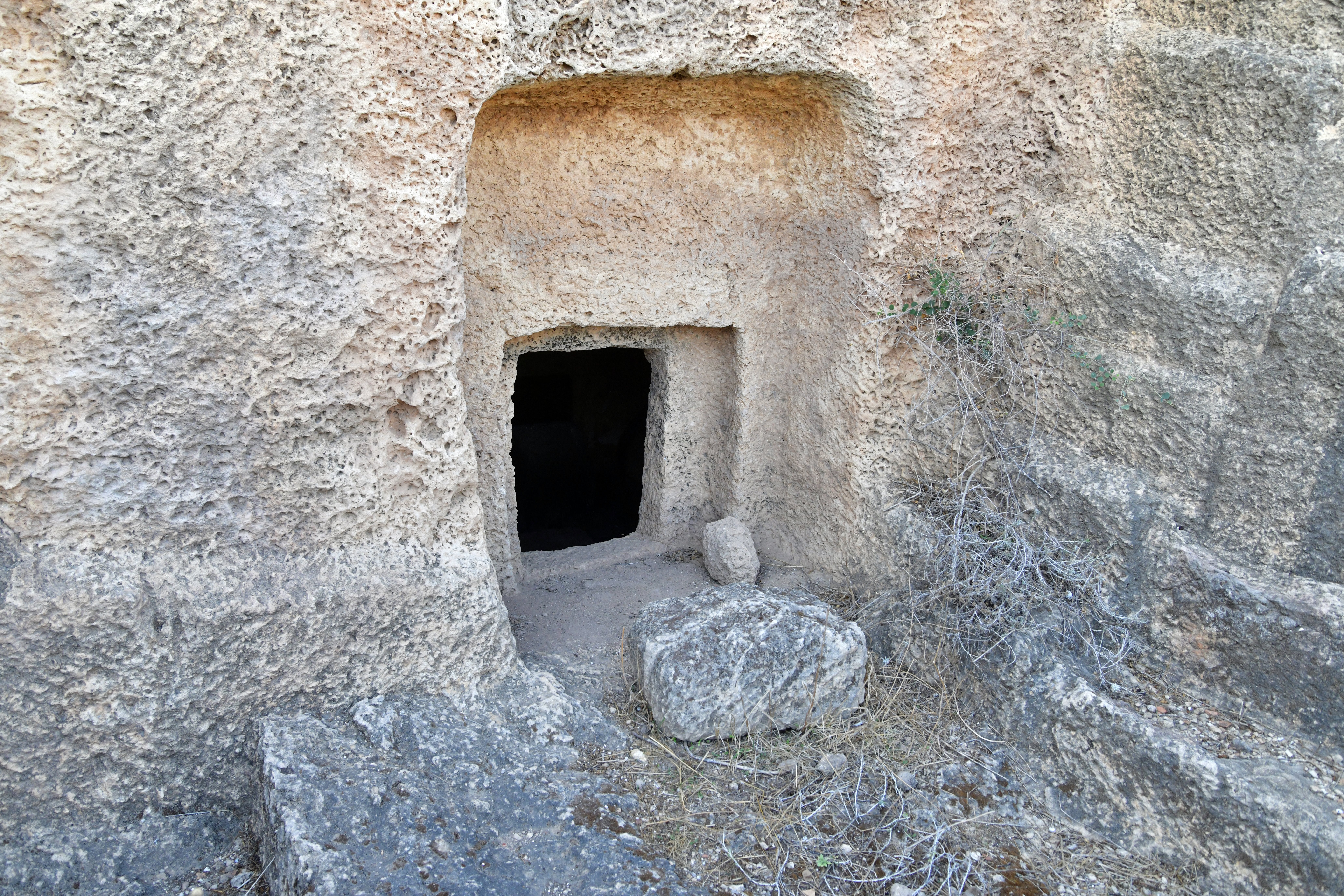The tomb is a burial cave hewn into the local kurkar (sandstone) bedrock.