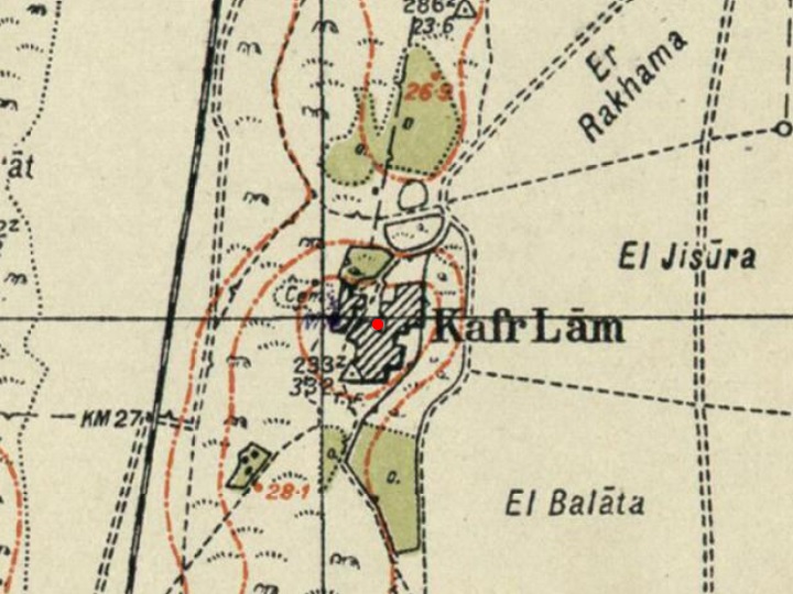 A section of the 1940s British map shows the area around Kafar Lam. The Arab village, now destroyed, covered the area of the fortress and north of it.
