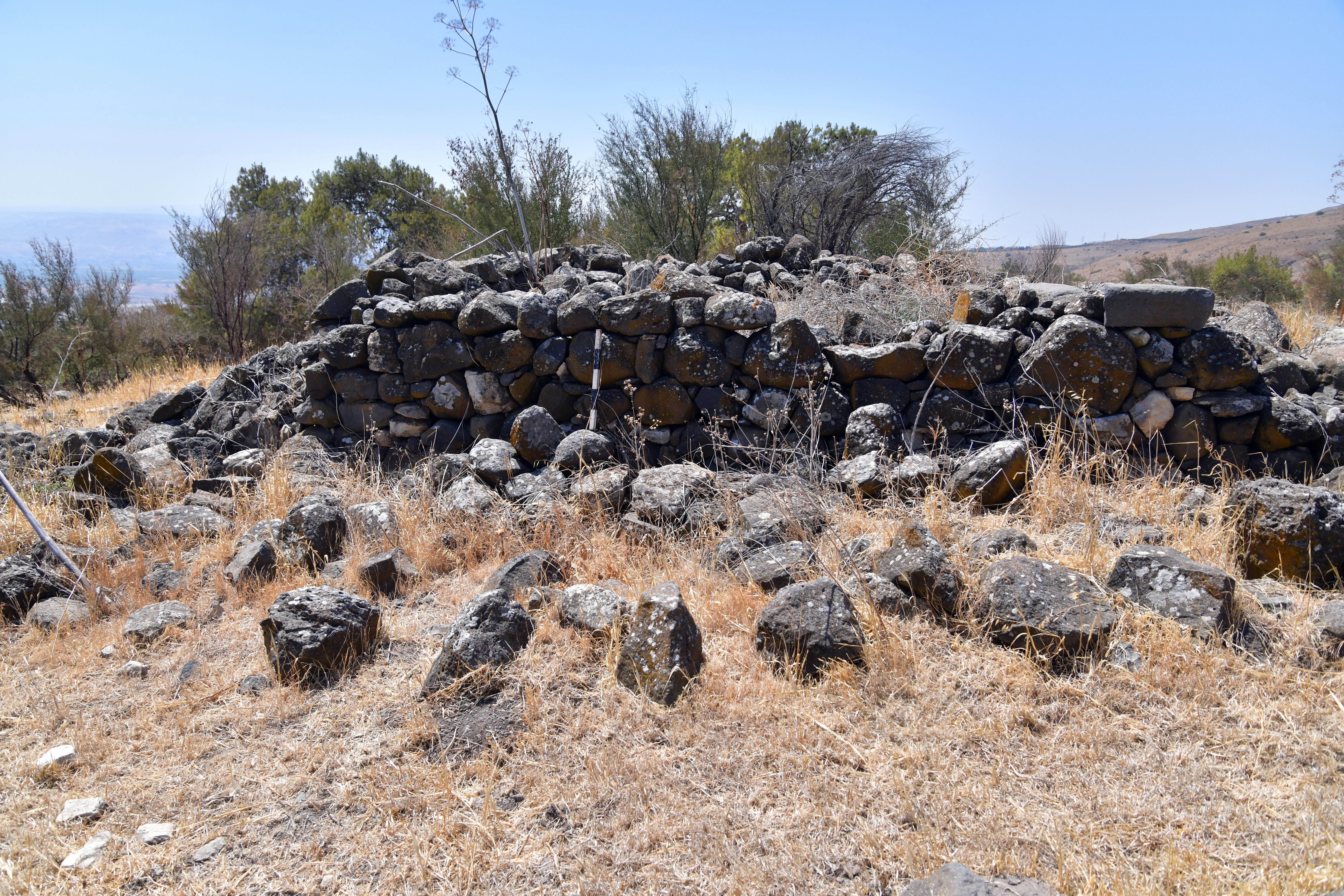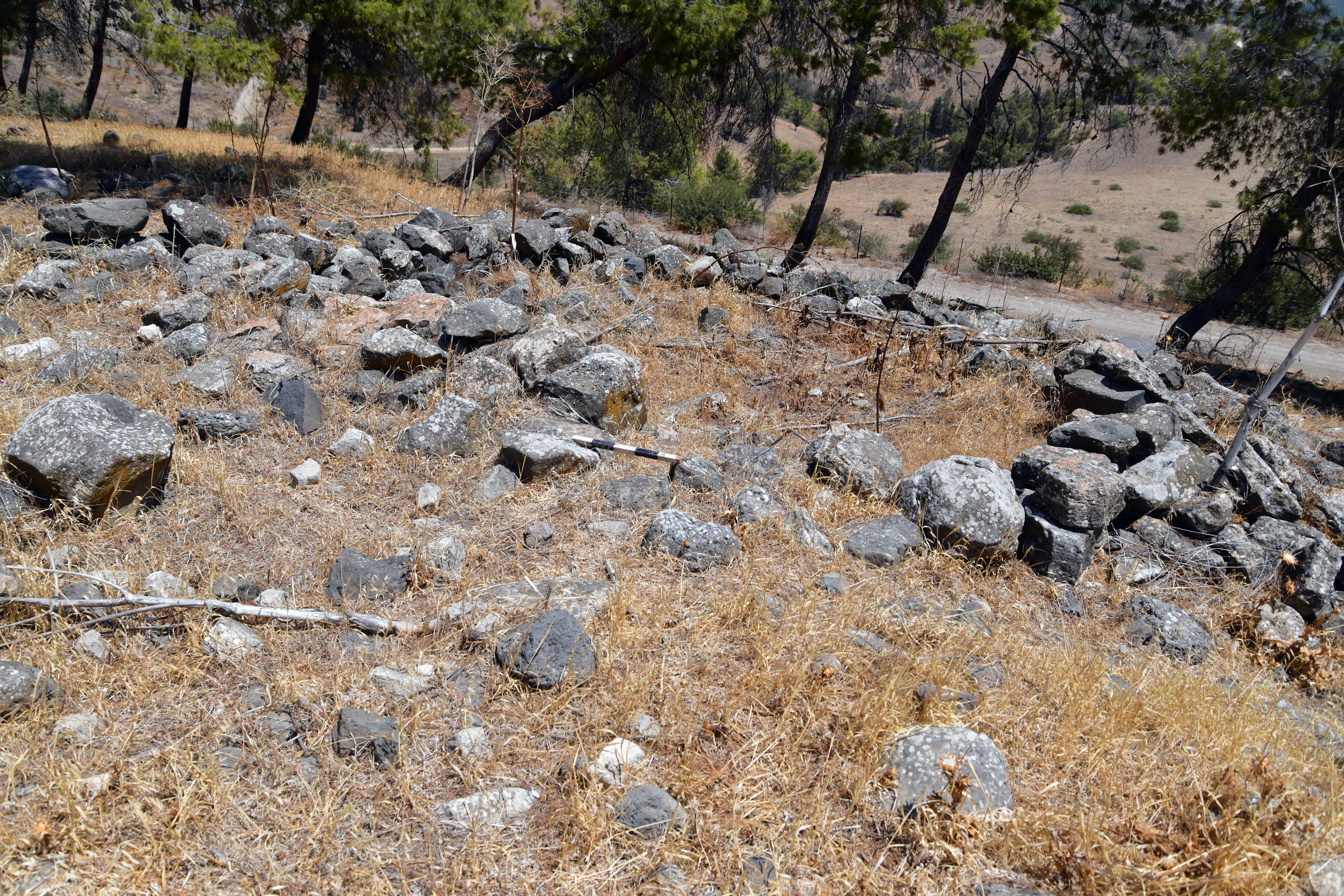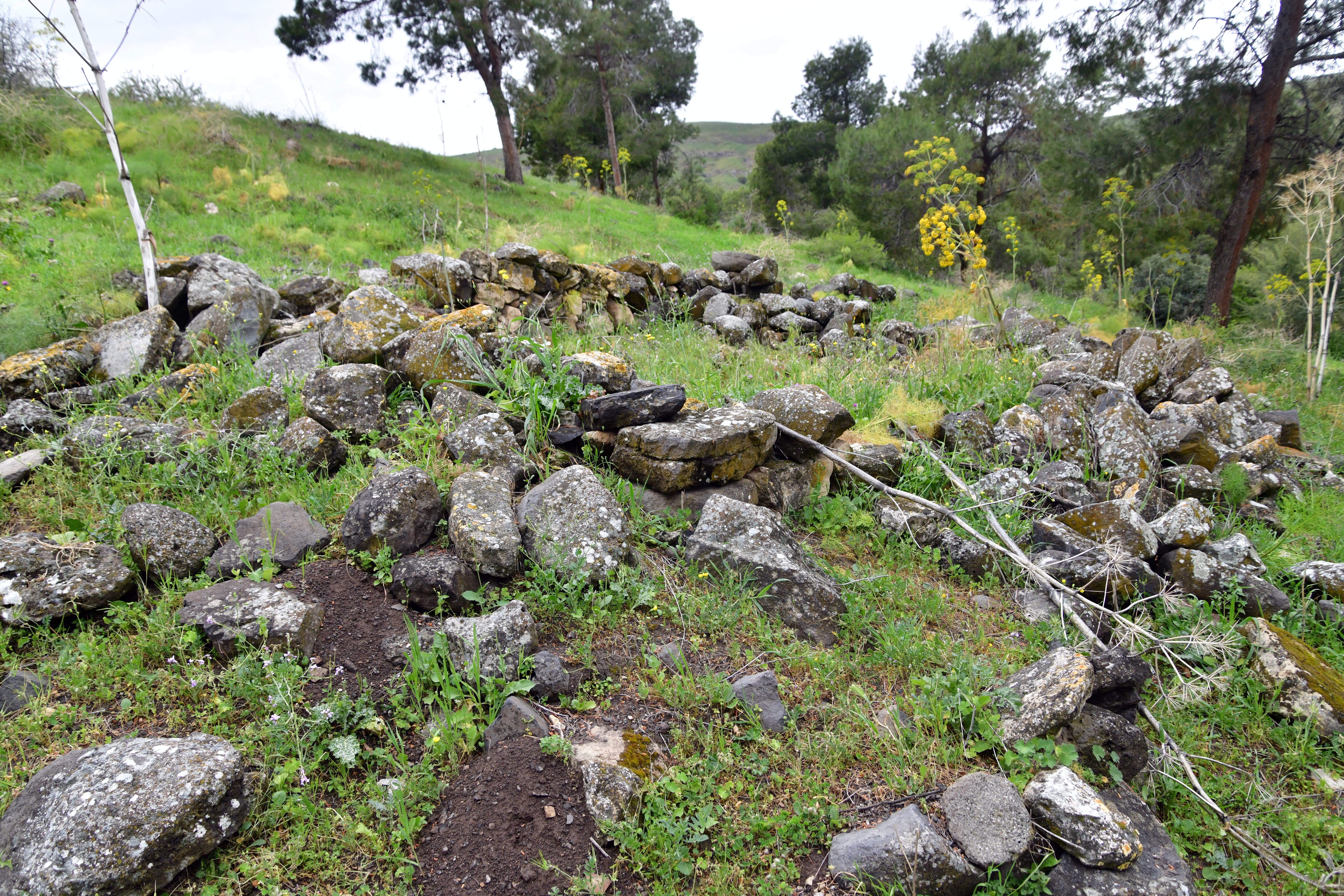 On the summit of the ridge are the remains of about a dozen ancient structures, their foundations built from local basalt stones. These may have formed part of a small fortified outpost or observation point, guarding movement along the ridge and overseeing access to the valley below. Our surface survey conducted at the site have revealed pottery sherds from multiple periods, including the Bronze and Iron Ages, as well as the Roman and Byzantine periods—indicating intermittent or continued occupation over a long span of time.