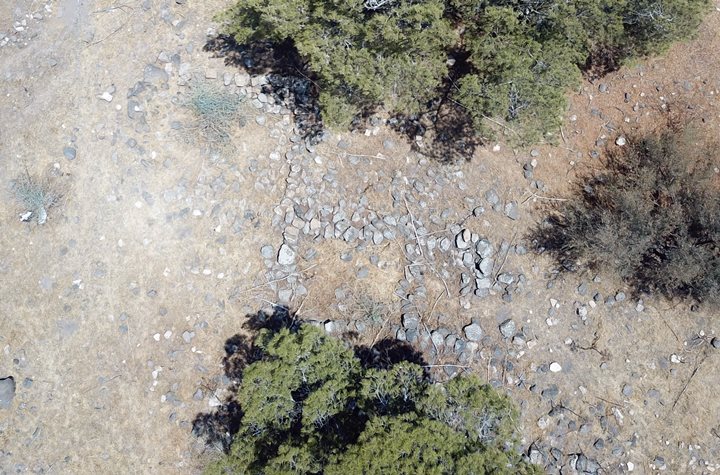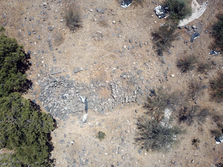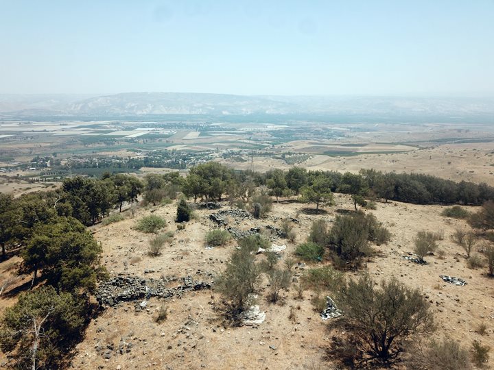 A drone view captured this eastern view towards the Jordan valley. Ruins of structures, made of rough basalt stones, are scattered on the peak of this hill.