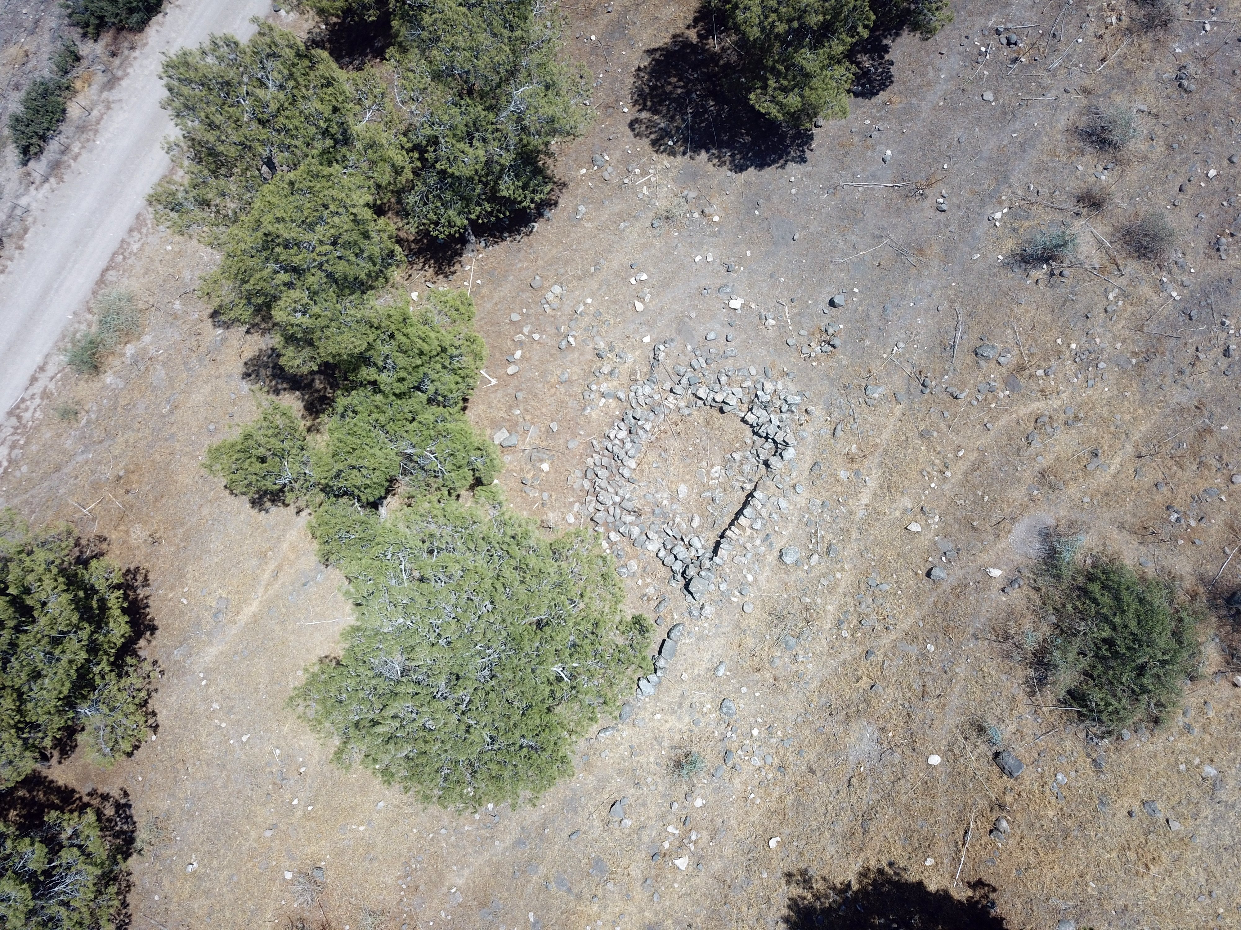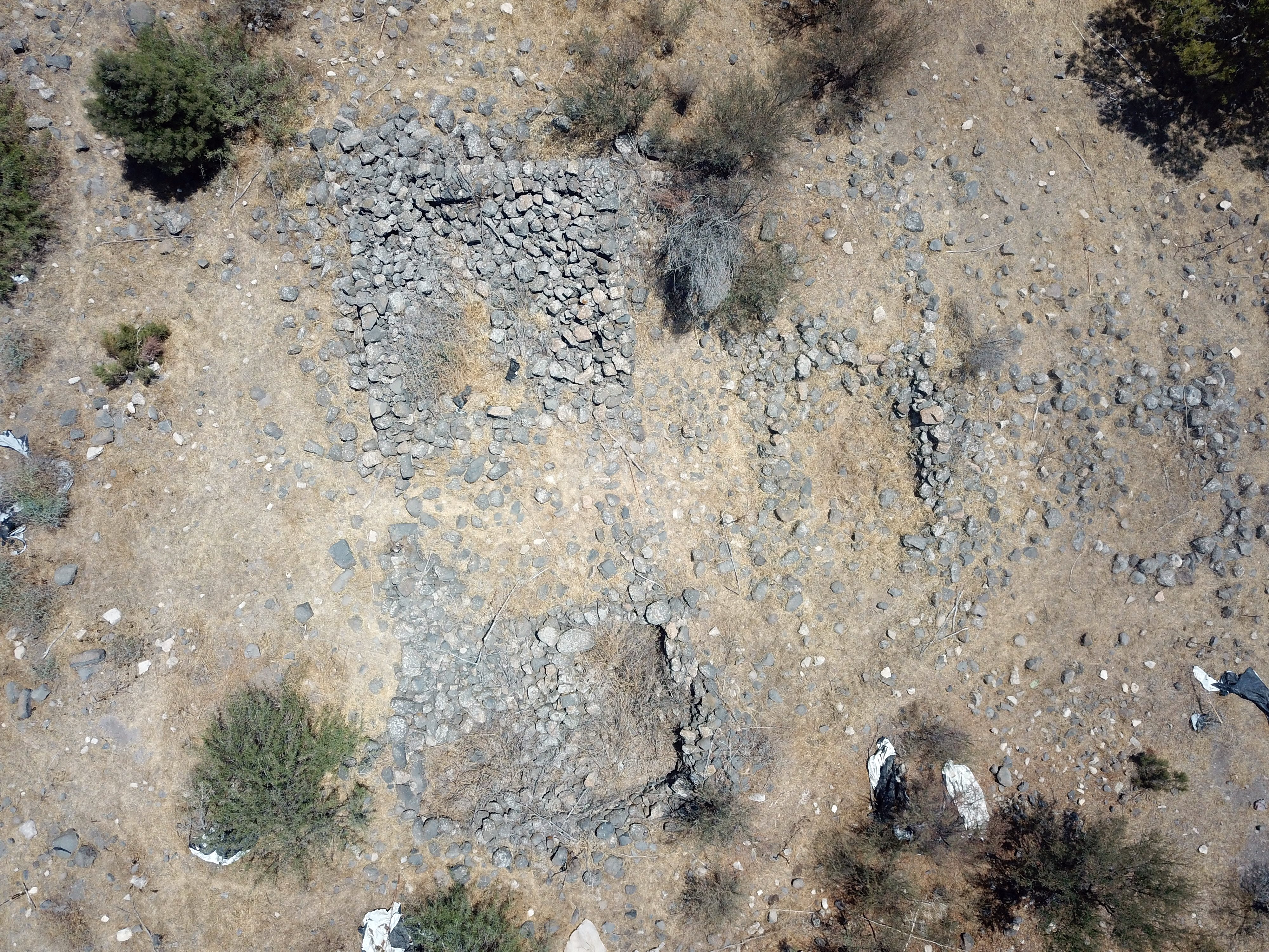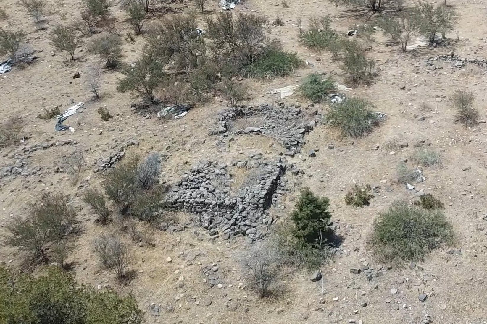 In the center of the site, on the summit of the hill, are several of the ruined structures. The structures are small, just a few meters in length, and made of rough basalt stones.