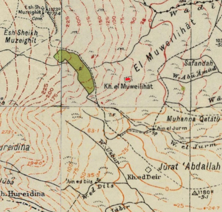 - Kh. El Muweilihat – as appear on British map.The name “al‑Muweilihat” (الموييلات) appears to derive from the Arabic root w‑l‑h, commonly used in words that signify beauty, radiance, or sheen (e.g. muweel from jameel, meaning “beautiful”). The feminine plural or diminutive form (‑‑ihat) may signify “the little radiant [ones]” or “the charming/well‑shaped ones”.Alternatively, it could be a tribal or family name referencing dwellers or landowners, but in the landscape context it likely refers to a scenic or renowned place.