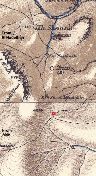 The area was examined in the PEF survey (1866-1877) by Wilson, Conder and Kitchener. A section of their map is seen here. The site is not indicated on the map, but we marked it as a red dot . A road is shown connecting the village of El Hadetheh (Bronze/Iron age Tel Ein Haddah) to nearby Mizpe Elot (esh Sheikh Muzeighit), but probably it descended thru Melahat and a-Dir. Another road descended from Sirin, passed near the site, and down to the Jordan valley.