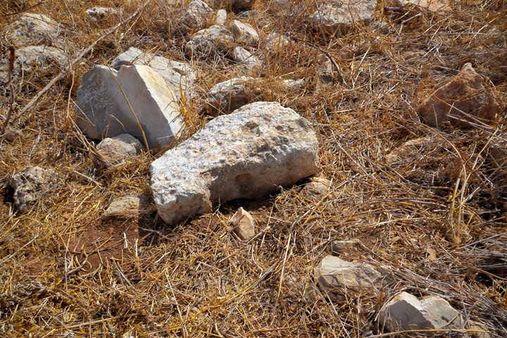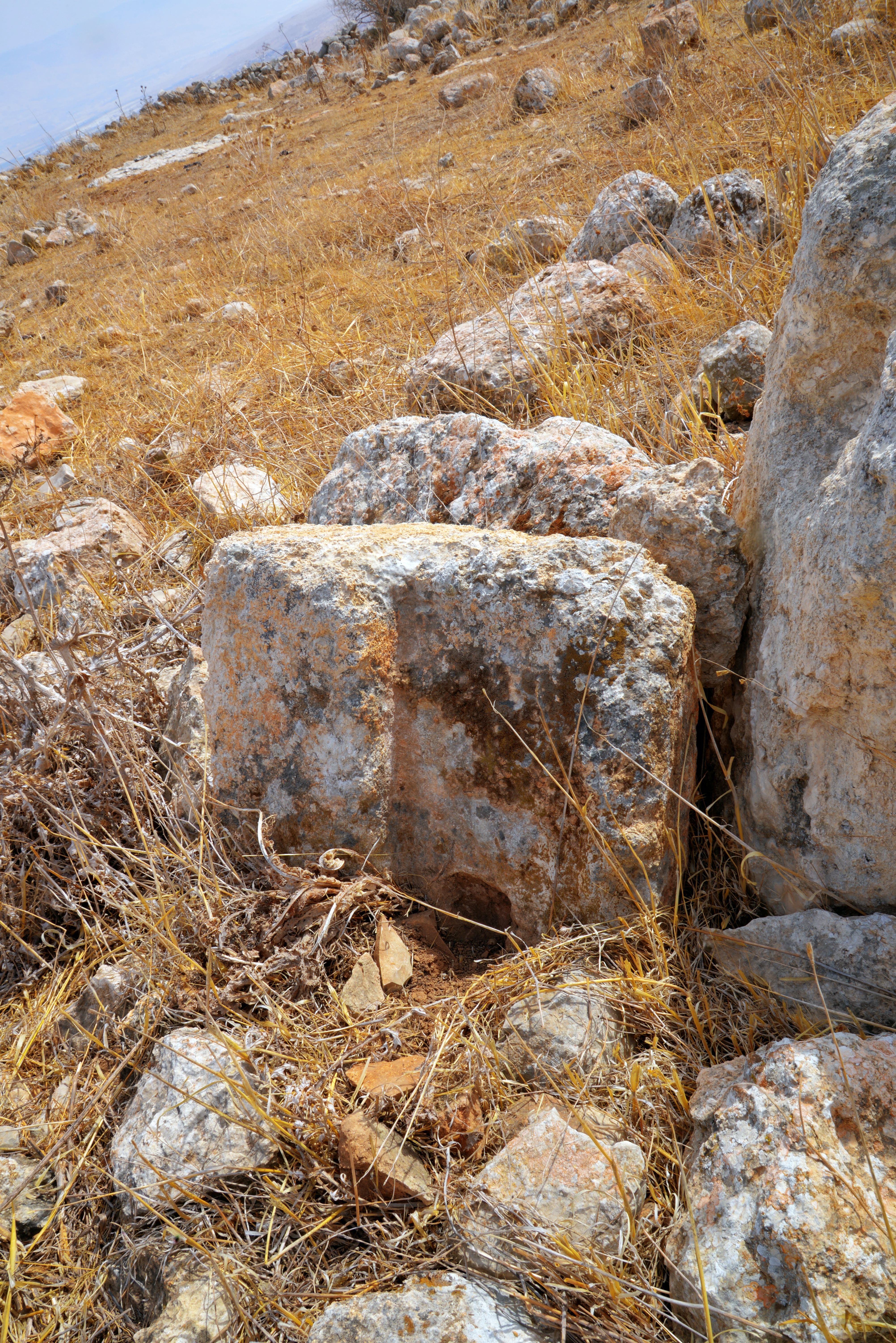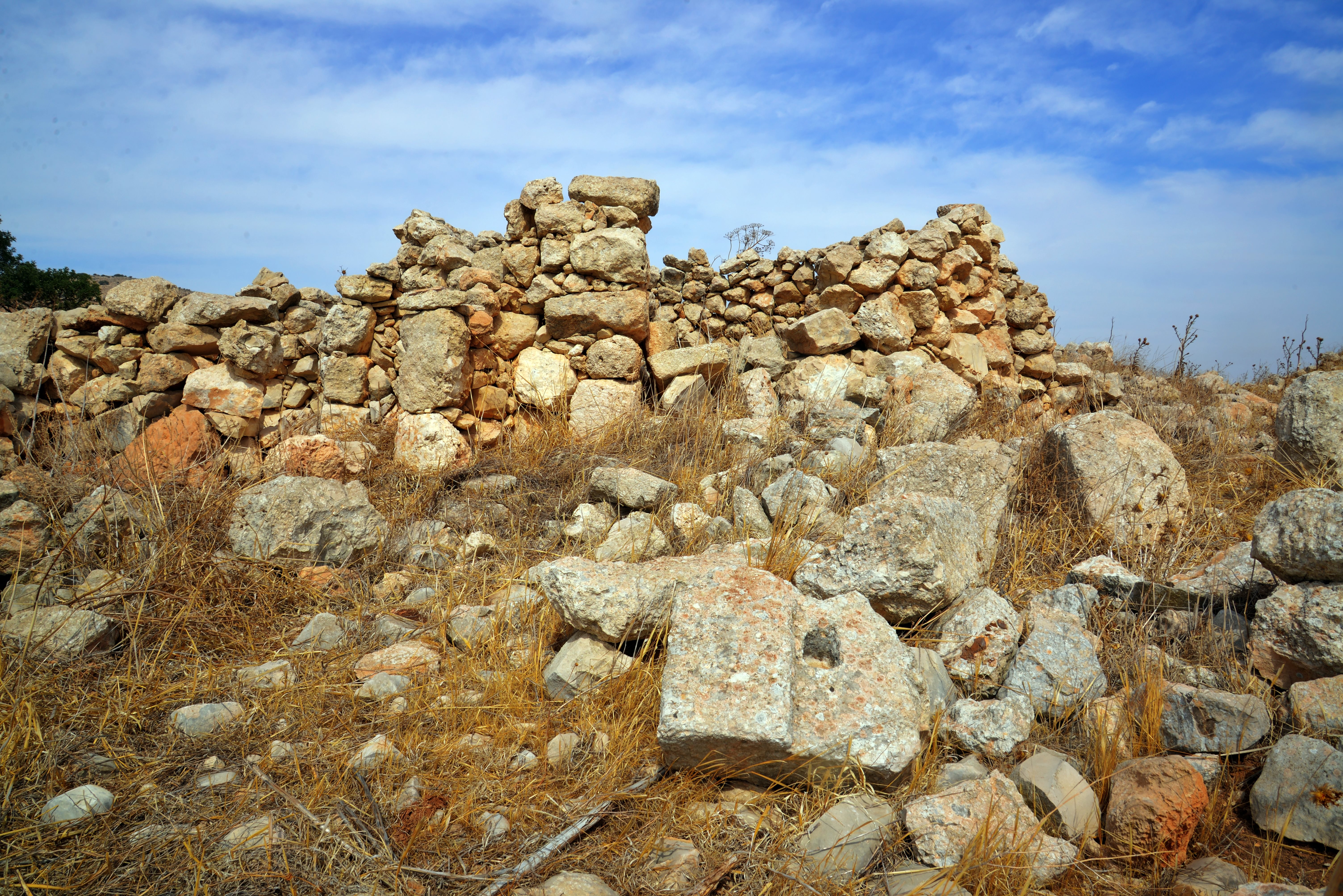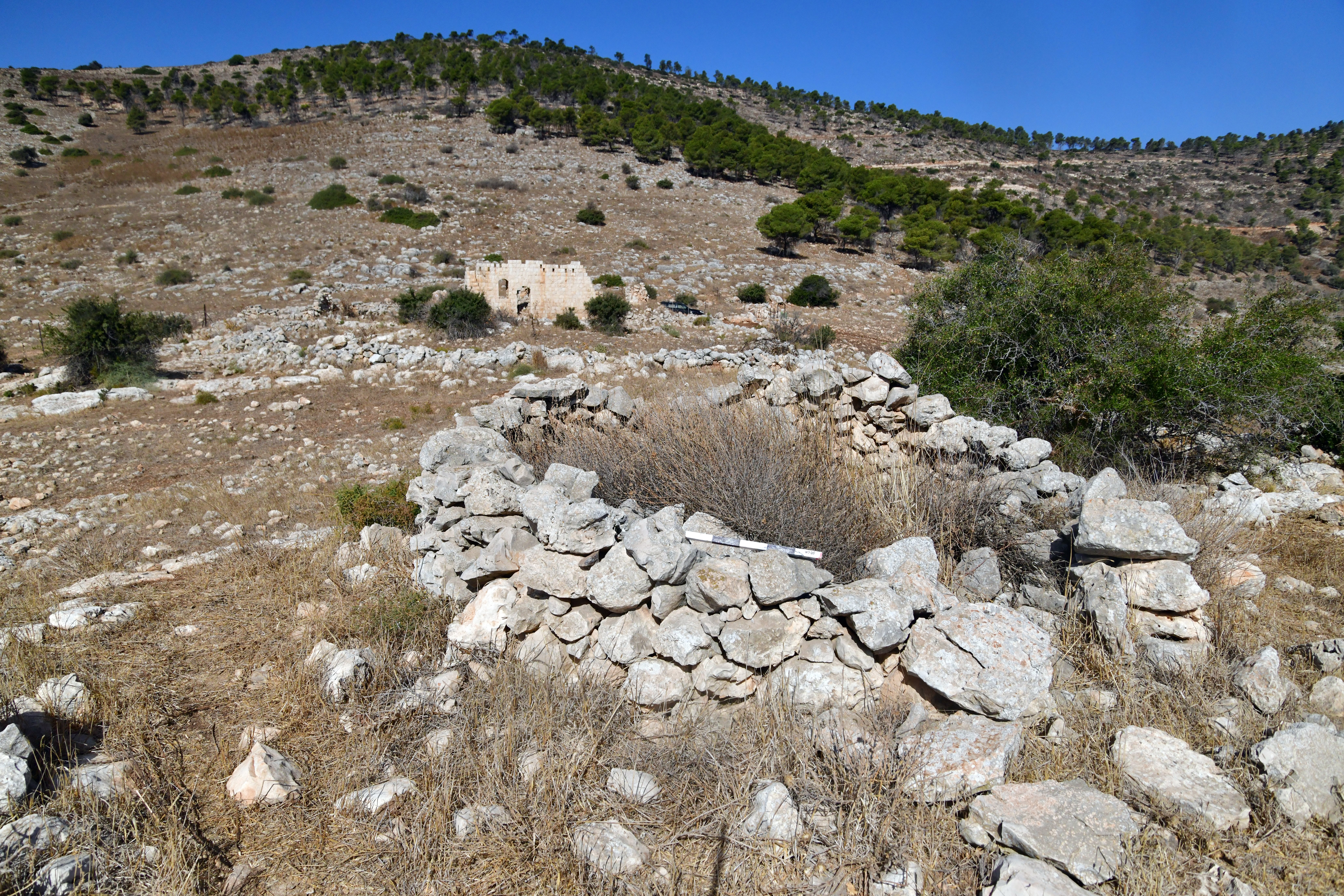 On the surface, massive walls are visible, constructed from dressed stones 1.2 meters wide, some featuring marginal drafting. Nine cisterns were counted at the site: eight bell-shaped cisterns and one open reservoir. Additionally, evidence of quarrying, stone troughs, and cupmarks are visible. Further up the ridge to the west, the entrances to two burial caves can be seen; a cupmark is hewn above the arched entrance of the western cave. Higher up the slope is a small, rock-cut wine press consisting of a treading floor and a collection vat. Throughout the ridge and the surrounding valleys, field walls, agricultural terraces, and stone clearance heaps are scattered.