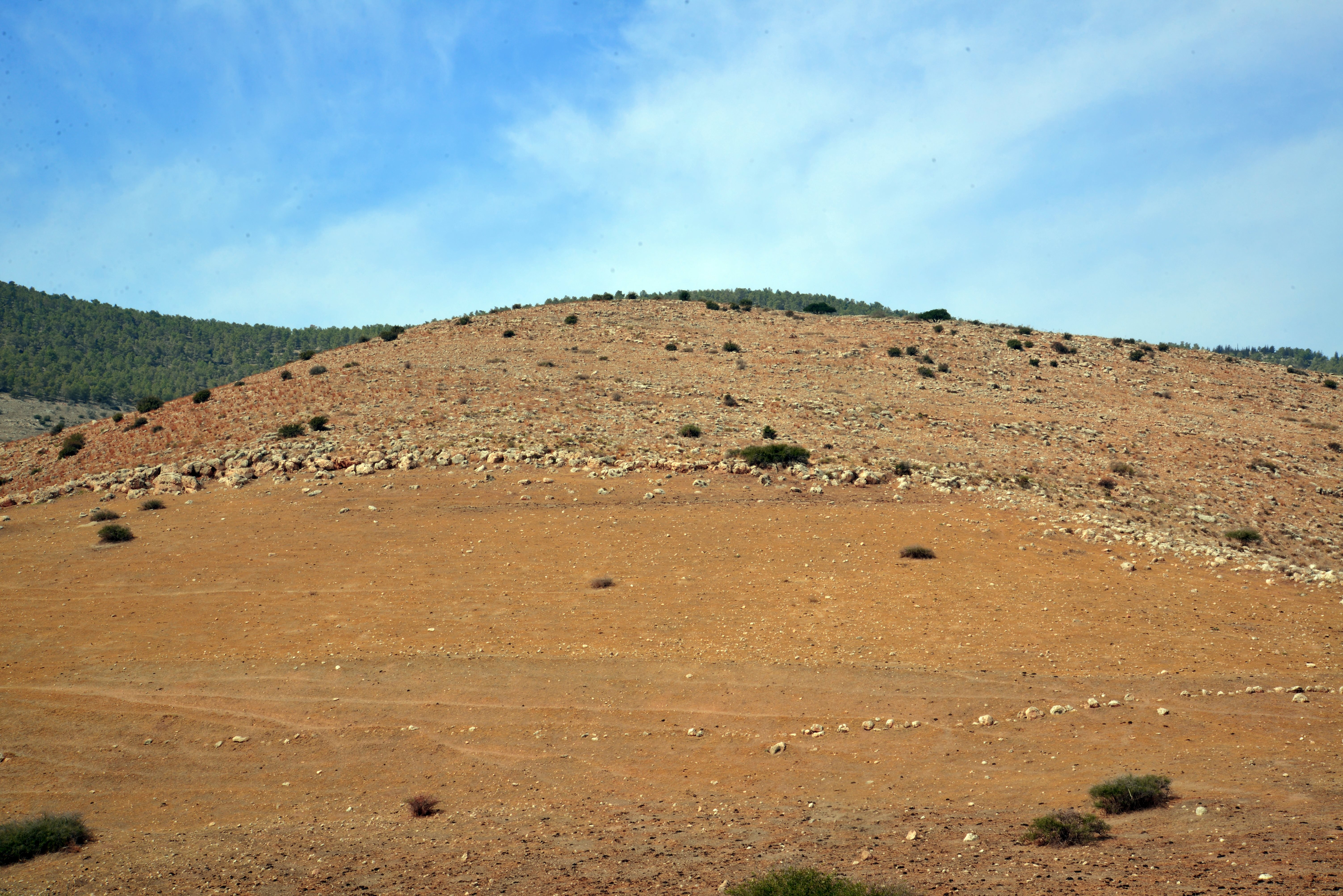 A western view towards the edge of the site. Mt. Gilboa is seen in the background, covered with bush and pine trees.