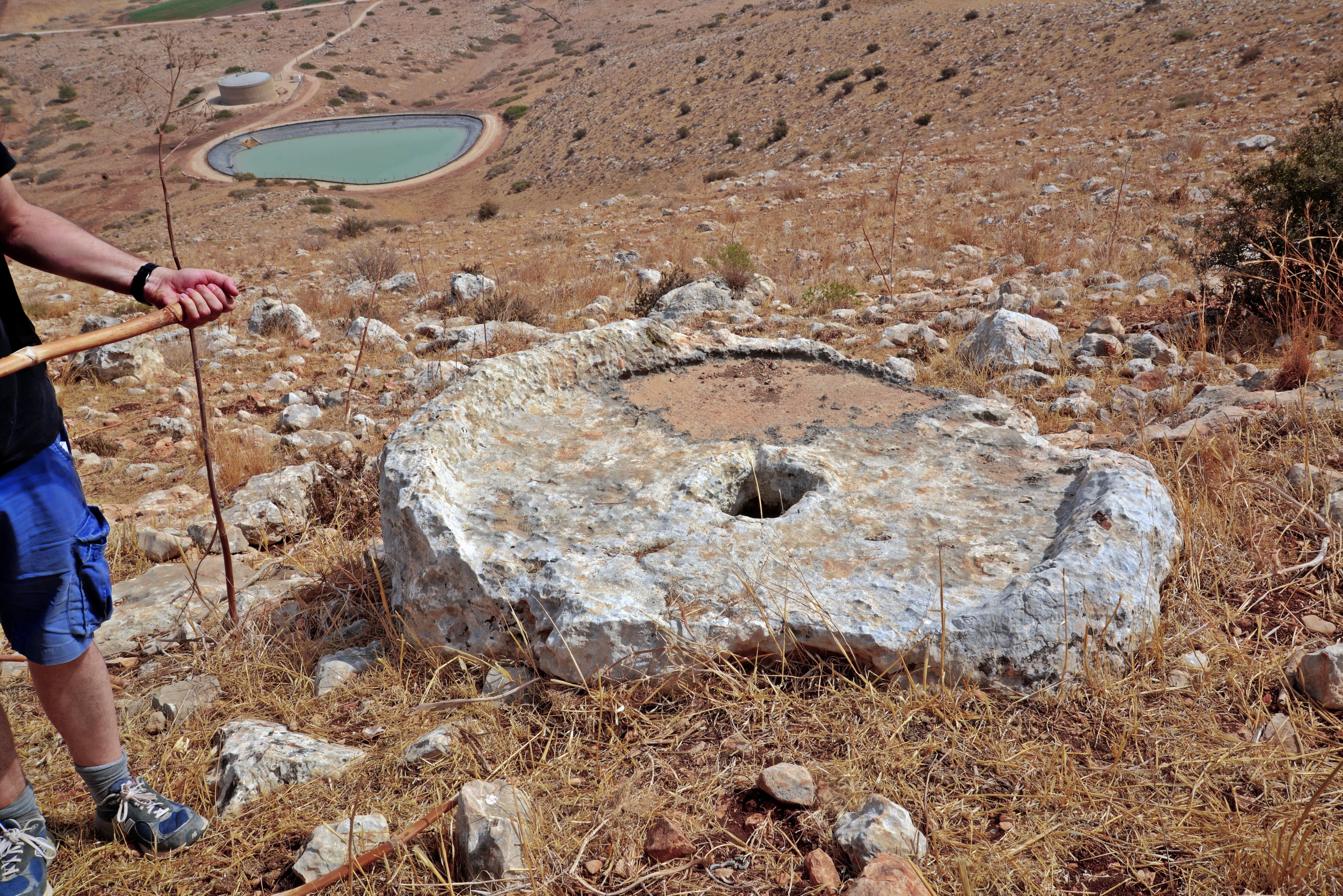 Along the ascent we saw a crushing base (“Yam”) of an oil press. This large, stationary circular stone vat was where the olives were placed. A heavy, vertical millstone (“Memel”) was used to crush the olives by rolling inside the basin. The cavity (or socket) in the center of the basin held a vertical wooden beam. A horizontal wooden axle passed through the center of the rolling memel stone. One end of this axle was attached to the central vertical beam held by that cavity.
