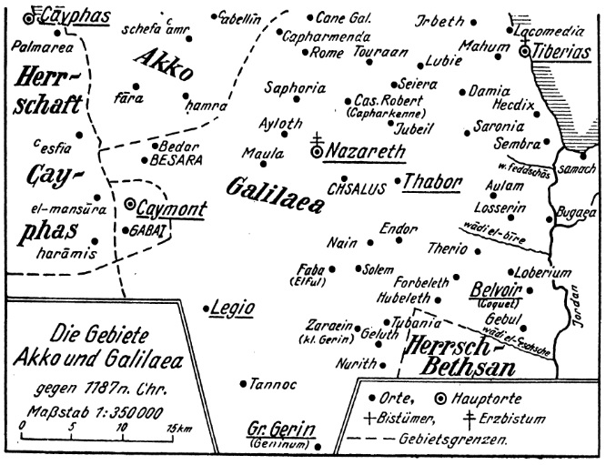 The name appears on the bottom of a map illustrating Crusader place names in Gustav Beyer’s 1945 Die Kreuzfahrergebiete Akko und Galilaea