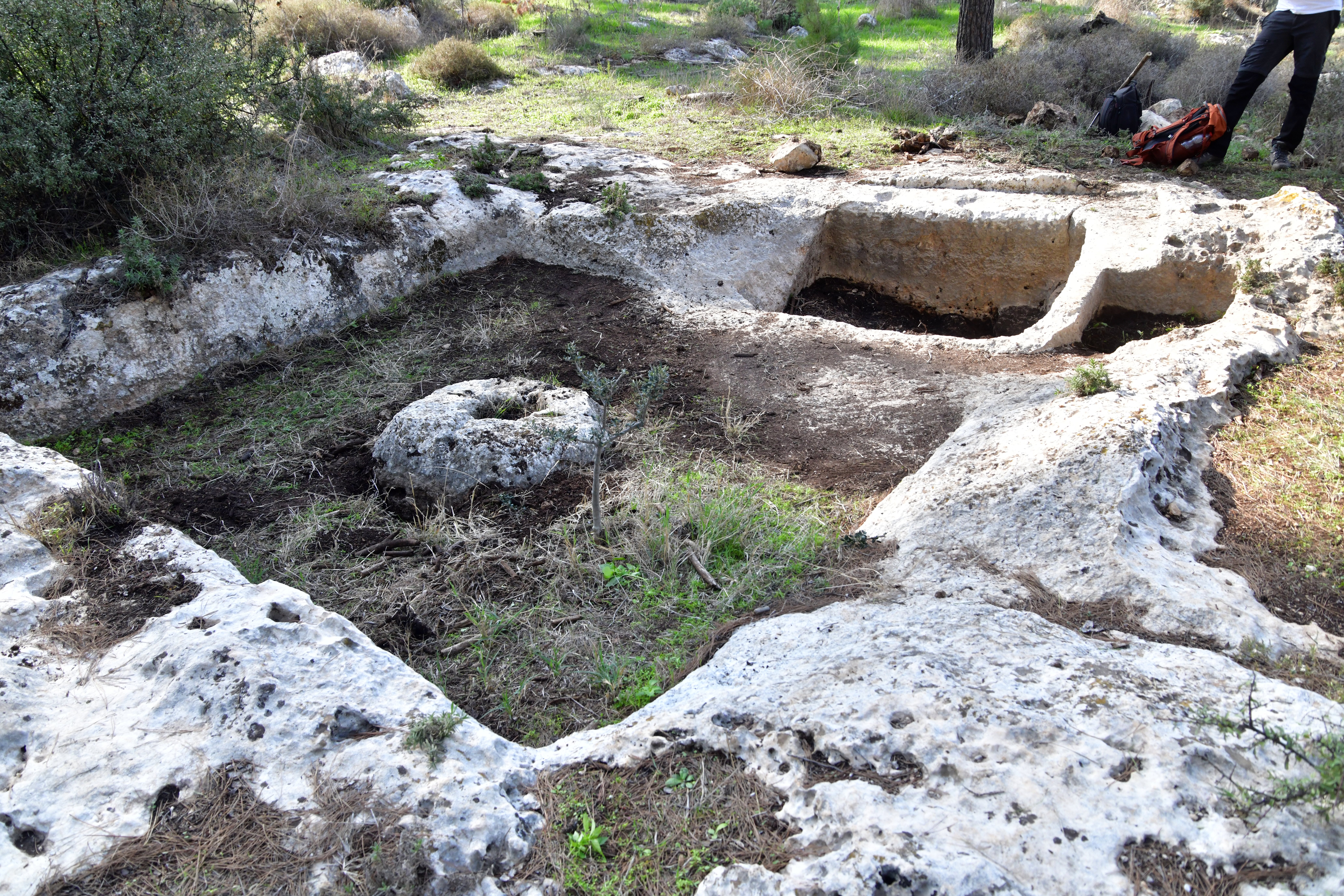 Nearby is a collecting vat of a Byzantine period winepress. Behind it is a large treading floor where the grapes were smashed with bare feet, and the juice would pour via a filter to the vat.