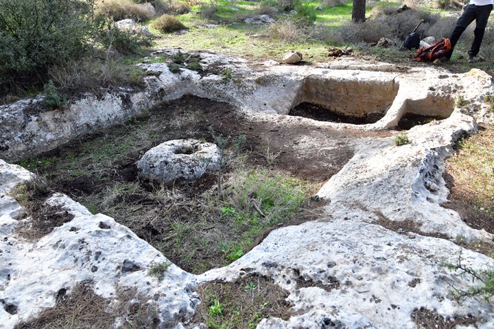 A large rock hewn cist grave was also found on a bedrock south of winepress 2. A cist grave is a small coffin like box, built with stones or cut into rock, holding the body of the dead. This grave is rectangular, 0.8m x 2.5m, 1m deep. Around the rim of the tomb is a wide frame for covering it with slabs.