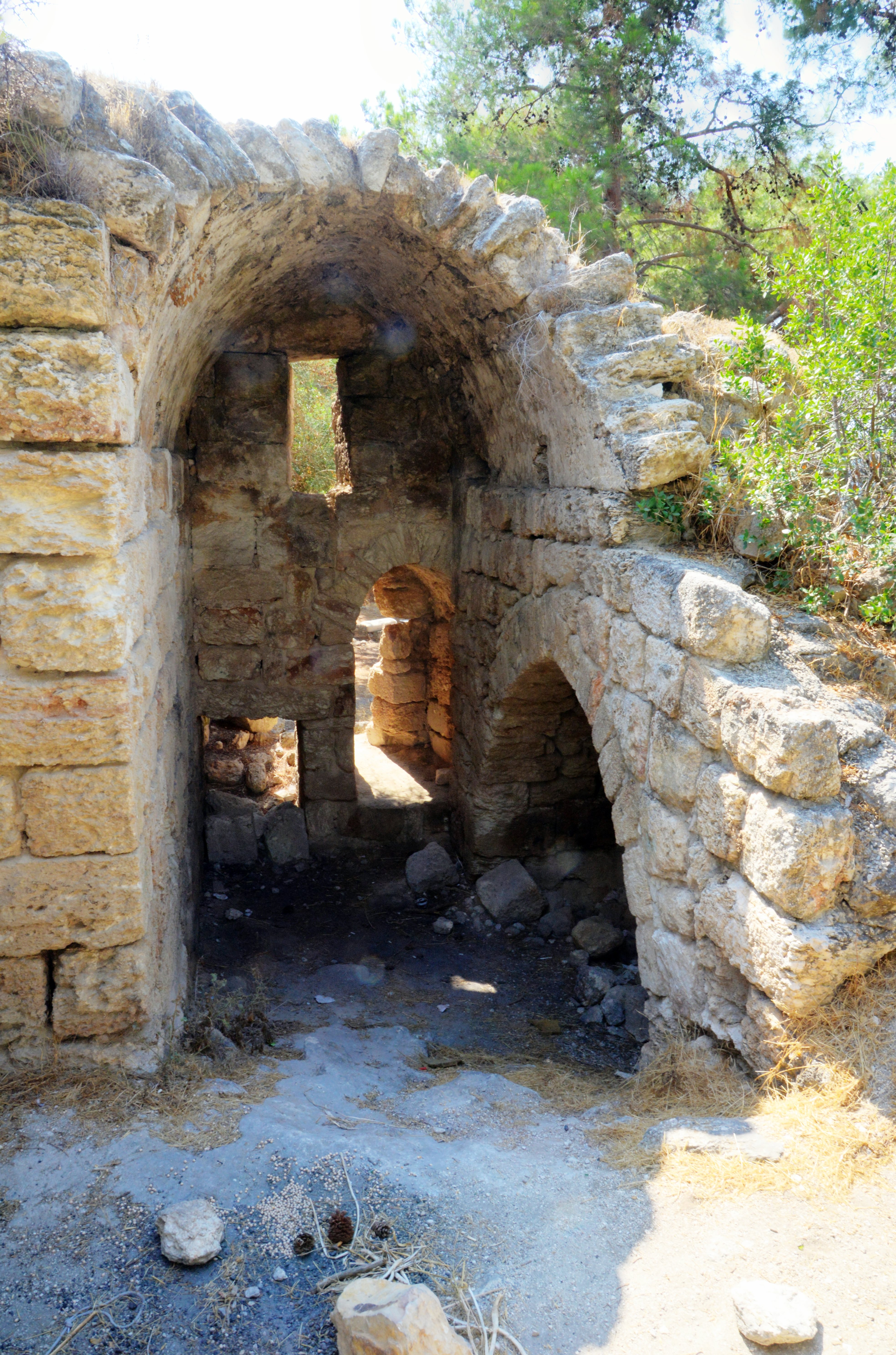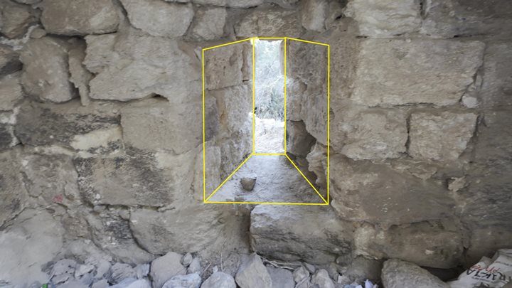 Between the extension and the main wall is another entrance doorway, leading to the south. It is also protected by an adjacent arrow slit. Both door and arrow slit are partially covered by debris and soil that accumulated over the years.