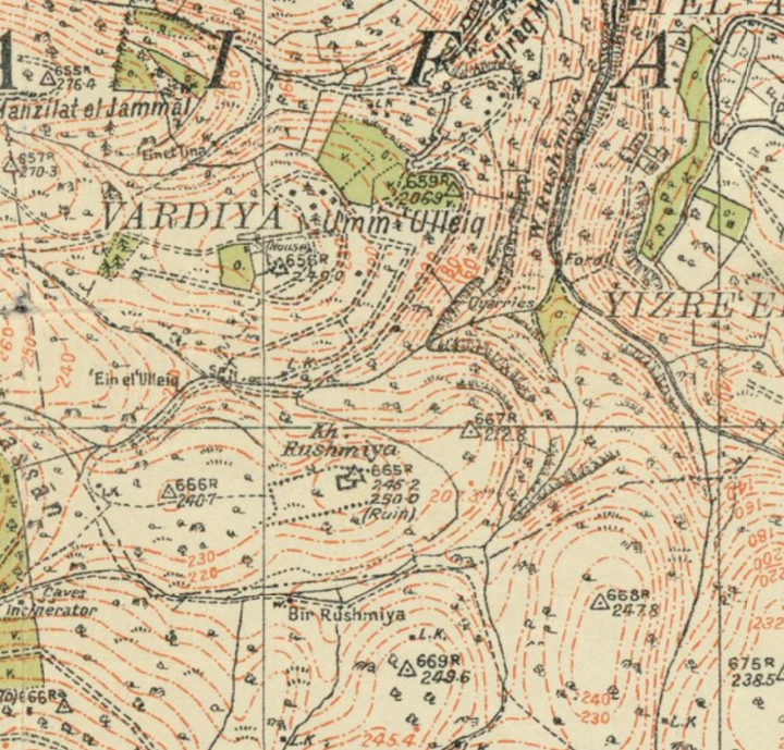 A 1940s British survey map of the area is shown here. The site is marked as Kh. Rushmiya.