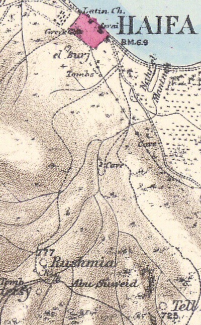 Conder and Kitchener surveyed this area during the Survey of Western Palestine in 1882. A section of their map is seen here, with Rushmia on a hill south of the walled city of Haifa.
