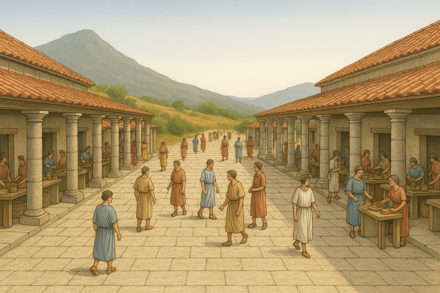The street itself measured 12 meters in width and was paved with diagonally set basalt stones. On both sides of the roadway were 5-meter-wide stoa —covered colonnaded walkways that offered shade and shelter. Behind these stoae stood rows of shops, each with a 1-meter-wide entrance and interior dimensions of approximately 3 by 3.6 meters. Excavations revealed six to seven such commercial units.