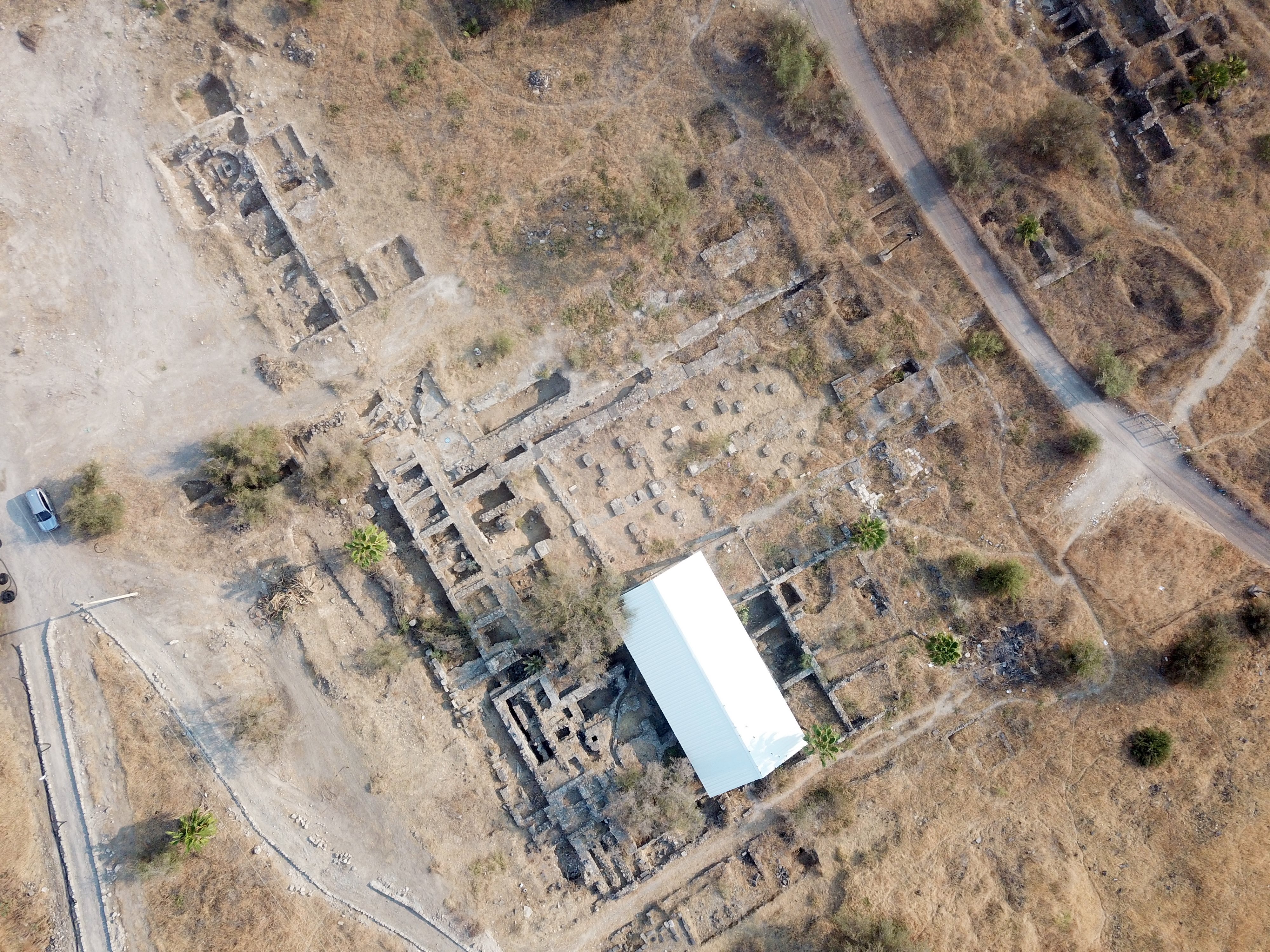 The next drone view, oriented towards the north and focusing on the bathhouse , shows the plan of the area around the bathhouse. Its eastern wing, with the mosaic floors, is under the white canopy roof. The western wing is to the left, adjacent to the Cardo Maximus. North of the bathhouse are the ruins of the city market.