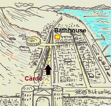The following illustration shows the plan of the Roman/Byzatine city. The main city bathhouse was located adjacent to the main south-north colonnaded street, known as the Cardo Maximus (see sketch – highlighted in yellow).