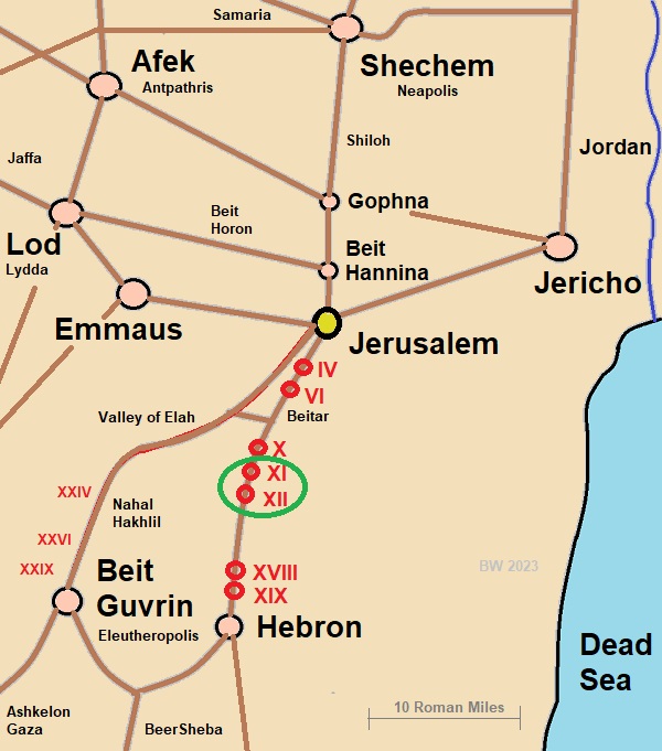 The Roman period route in the area of Gush Ezion was slightly west to the Iron Age period route. In this area there were 3 milestones (from south to North): 12th (XII) – east of Beth Zechariah, south of Elazar, 11th (XI) – north west of Elazar and tenth (X )- East of Neve Daniel. The number indicates the distance in Roman Miles (1 Roman mile = 1480 m, or 0.92 miles) from the starting point in Jerusalem.