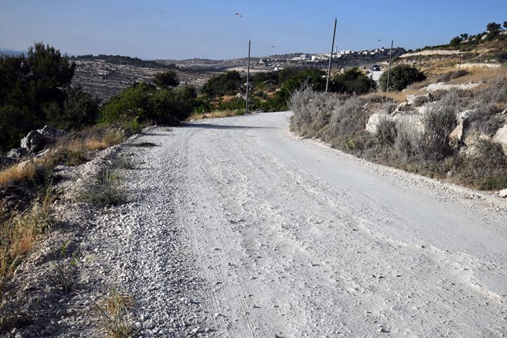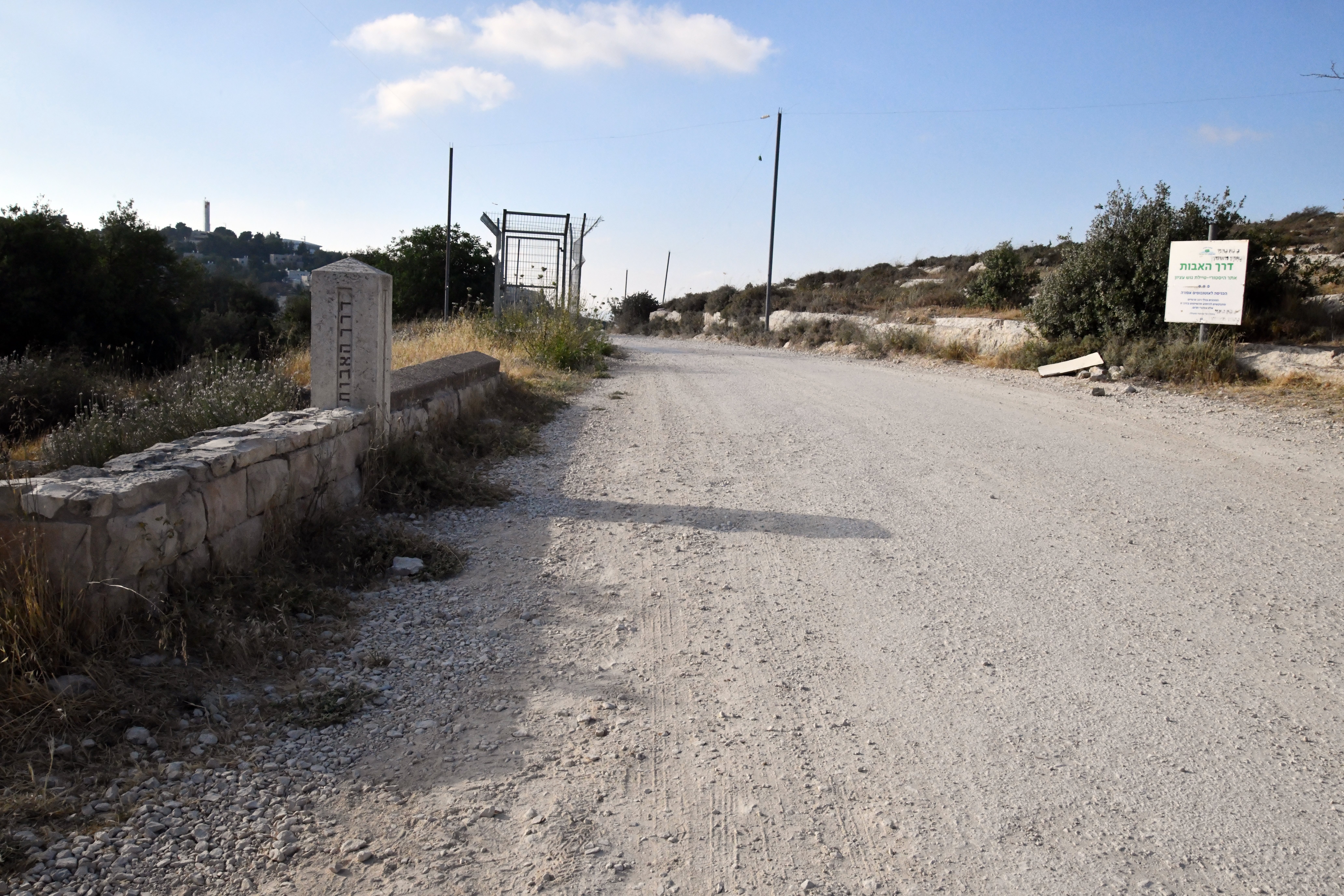 On the side of the road are stone markers with the sign “דרך האבות” (Patriarchs way).